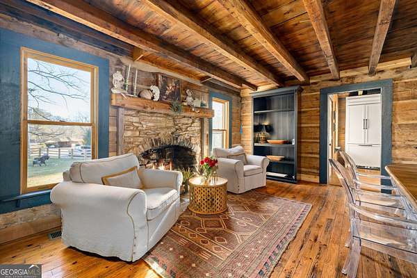 A rare blend of rustic authenticity and serious upgrades, this log cabin delivers space, craftsmanship, and comfort in equal measure. The home has been extensively improved with new HVAC systems in 2024, updated electrical and plumbing throughout, and a tankless water heater for dependable, on-demand hot water. The kitchen is designed to impress with granite countertops, a gas cooktop, premium appliances, and a custom-built island that anchors the space. Rooms showcase the beauty of the original log construction, revealing just how expansive this cabin truly is. Multiple living areas include a generous dining room and living room, both centered around striking stone fireplaces, along with a dedicated office and large laundry room. Outdoors, a wood fence reinforced with hog wire encloses a wide-open yard ready for whatever vision comes next, gardens, gatherings, or simply room to breathe on the 3 acres.