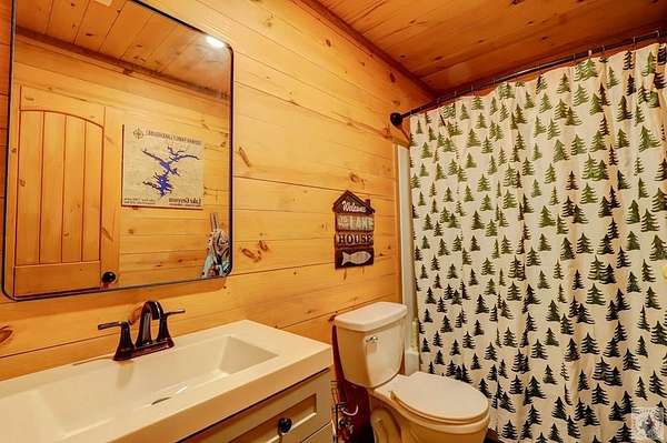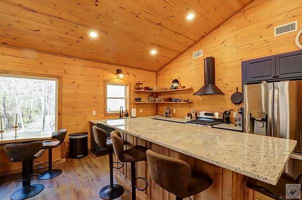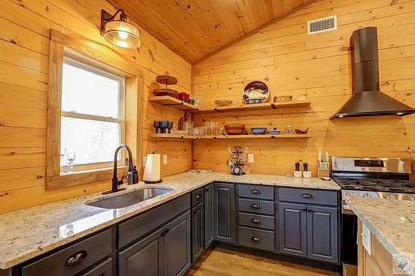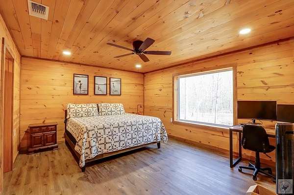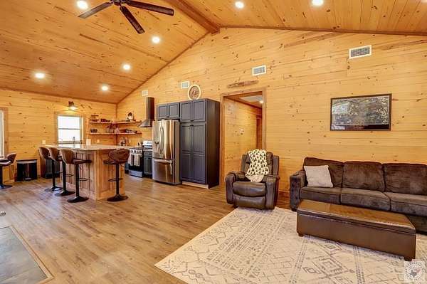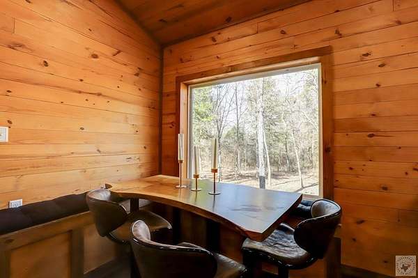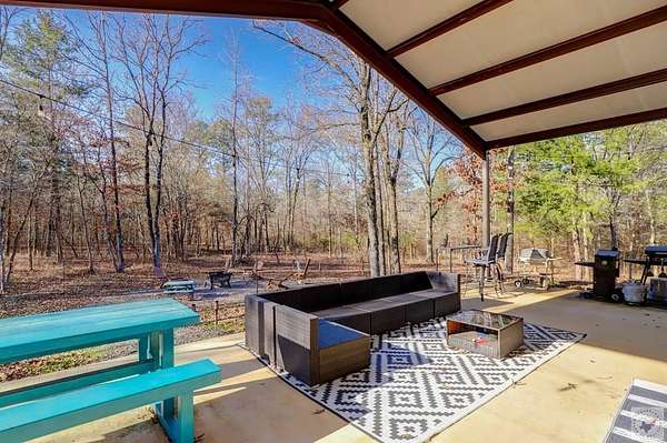 Nestled on over 2 acres and backing up to Corps of Engineers land, this beautifully finished barndominium at 28 Funderburk Rd. offers the perfect blend of comfort, privacy, and proximity to recreation. Conveniently located near Lake Greeson and Cowhide Cove Recreation Area, this property is ideal as a full-time residence, weekend getaway, or vacation rental. The home features two oversized bedrooms, including a spacious primary suite with a large walk-in closet and a spa-like en suite bath showcasing quartz countertops and a walk-in shower. The second bedroom is equally generous in size and easily accommodates multiple bunk beds. A well-appointed hall bath offers quartz counters, dual sinks, and a tub/shower combination. The open-concept living area provides abundant space for gathering and entertaining, highlighted by large windows that bring the beauty of the surrounding nature indoors. The kitchen is designed for both function and style, featuring a large work island with storage, ample cabinetry, pantry, gas cooktop, refrigerator, and a dedicated drink refrigerator. A banquet area with a stunning live-edge table comfortably seats 6-8 guests. A wood-burning stove adds warmth and ambiance, complemented by central heat and air conditioning for year-round comfort. Step outside to enjoy two expansive covered porches, perfect for lounging or entertaining, along with an outdoor kitchen area complete with a sink. There's plenty of space to park a boat or vehicle. Additional features include luxury vinyl plank flooring throughout, an oversized utility room, public water, septic system, a storage building, and a firepit for evenings under the stars. This thoughtfully designed property offers peaceful surroundings, modern finishes, and easy access to the lake-an exceptional opportunity you won't want to miss.
