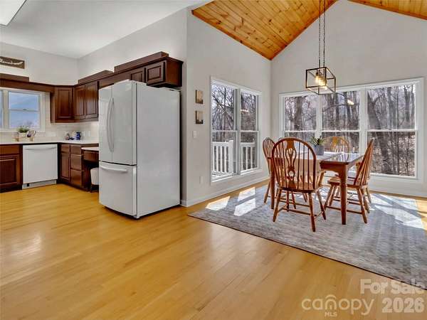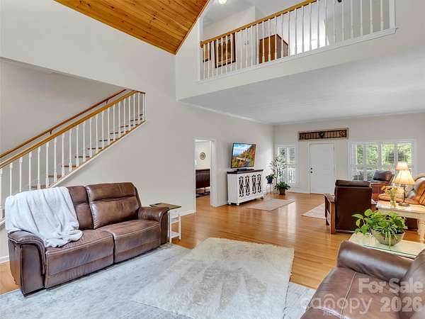 Escape to your own serene mountain retreat with this stunning private estate situated on nearly 7 acres. Enjoy breathtaking year round mountain VIEWS, a tranquil waterfall cascading into a goldfish pond, & a gated paved drive offering privacy & easy access. Enter the heart of the home from a beautiful covered porch to a spacious great room with a vaulted tongue & groove ceiling, built-ins & multiple sitting areas-ideal for entertaining or relaxing by the fire. The kitchen boasts rich cherry cabinetry, new quartz countertops, new tile backsplash, freshly painted, generous pantry & opens to the dining area, with ample space for gatherings. Powder Room off of the kitchen with new quartz. Primary suite on the main level features a luxurious remodeled bath & large laundry room for ultimate convenience. Upper level offers a 2nd primary suite, loft, & additional bedroom, all perfect for guests or family. Lower level has an expansive family room that sets the stage for movie or game nights with family & friends. This home is the perfect blend of comfort, space, & nature's beauty. Imagine relaxing on the porch, taking in the peaceful mountain setting-perfect as your own private retreat or has wonderful potential for a short term rental. Experience mountain living in this beautiful home ideally located in the heart of Maggie Valley. NEW ROOF 2026....FURNITURE NEGOTIABLE