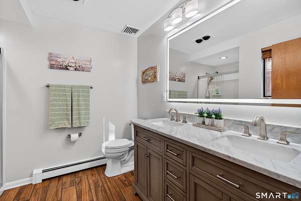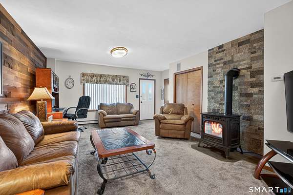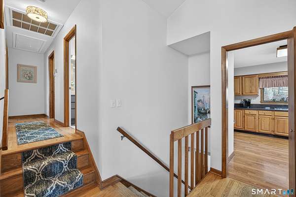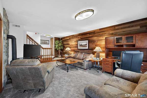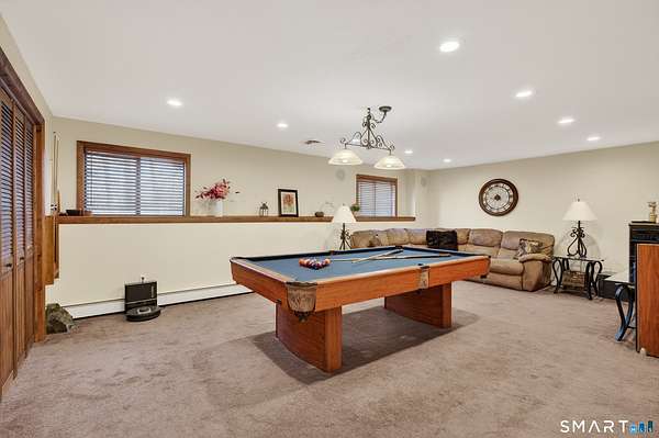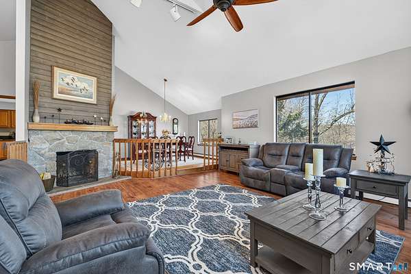 A striking contemporary ranch that lives with warmth, light, and intention. From the moment you enter, the vaulted ceilings draw your eye upward, embracing natural light that pours in through oversized windows and elevating the main living space with effortless volume. The well-appointed eat-in kitchen brings the heart of the home to life with hardwood cabinetry, stainless steel appliances, and granite countertops, making everyday cooking and gathering feel special. Down the hall, three comfortable bedrooms frame the main level, each at ease with the quietness of the property and the thoughtful renovations throughout. The fully finished lower level impresses with continuity and function - not below ground, but at grade - creating an incredible second chapter to the home. Here, you'll find a family room and media space, a second living area, the laundry room, and a flexible bonus room currently serving as a home gym, with a prior life as a fourth bedroom. This versatility expands how the home can live, grow, and entertain. All three bathrooms have been beautifully renovated, and recent updates continue into new carpeting on the stairwell and lower level family room, underscoring the pride of ownership felt throughout. Cherished and meticulously maintained, this home has held family, celebration, and quiet mornings; and now stands ready to welcome its next chapter.