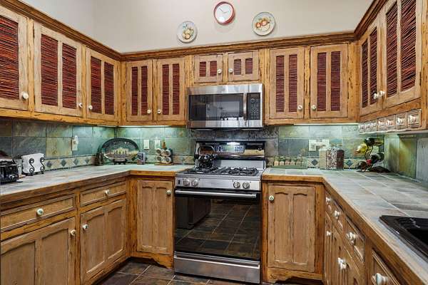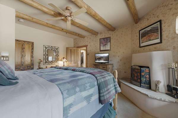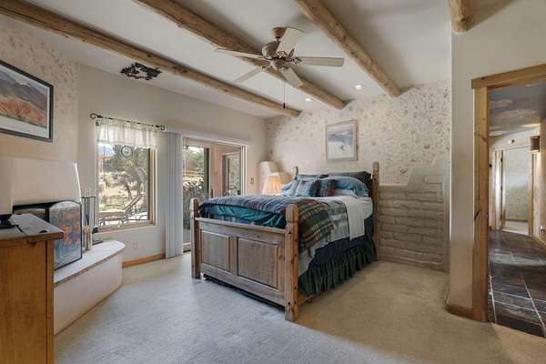 - Beamed Ceilings, Ceiling Fans, Central Vacuum, Dual Sinks, Jetted Tub, Main Level Primary, Walk In Closets