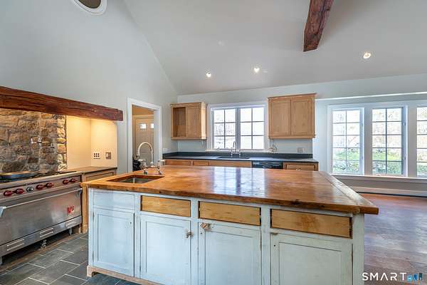 Circa-1790s antique colonial on 8 park-like acres with historic barn and West Aspetuck River frontage-offered as is. Two repurposed grist mill stones-relics from when the barn served as a working mill-are now embedded in the stonework: one in the front patio steps, another leading to the entrance. The original home features wide-plank antique floors and a period fireplace in the living room. A 1970s addition provides a main-floor primary suite with ensuite bath. The most recent expansion is an 800-square-foot great room with soaring ceilings, French doors, and walls of windows framing idyllic views of the barn and fields. A second fireplace anchors the space. The kitchen features a center island, wolf stove and soaring ceilings. These spaces await your finishing touches, while the former kitchen area can to be redefined to your needs. Upstairs, one bedroom, full bath, and a flexible office/studio space complete this antique gem. Sold As Is.