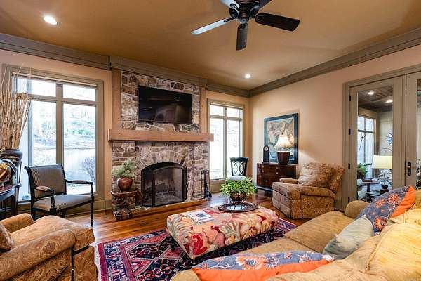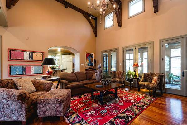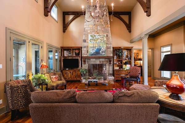 Luxurious yet warmly inviting, this elegant home blends timeless design with rich rustic character and exceptional craftsmanship. An impressive entry with custom doors opens to a stunning great room with soaring wood beamed ceilings, a massive stone fireplace, and beautiful heart pine flooring thru-out the main living areas. French doors extend the living space to a screened outdoor retreat. The kitchen is both beautiful and functional, offering honed and polished granite countertops, a generous center island, and seamless flow to a cozy hearth room with casual dining and a gracious formal dining space. Remarkable custom woodwork throughout the home adds warmth, depth and timeless appeal. The primary suite is a private sanctuary with an incredible spa like bath that must be seen to be appreciated and generous closet space. The main level also includes a guest en-suite, private office, and a well designed laundry room with built in desk and shelving. Upstairs offers two additional en-suite bedrooms, a large bonus or game room, and a separate sitting area. Set on 5 beautifully landscaped acres with mature trees, a tranquil waterfall, three car garage and abundant storage. Come see!