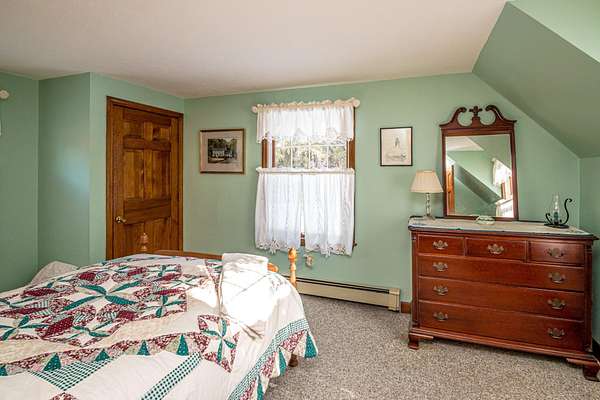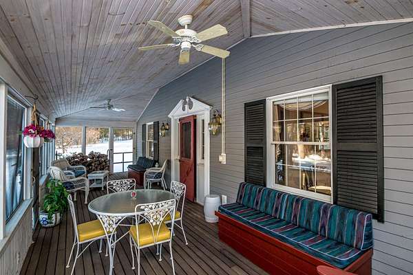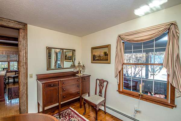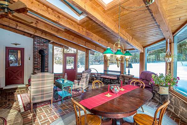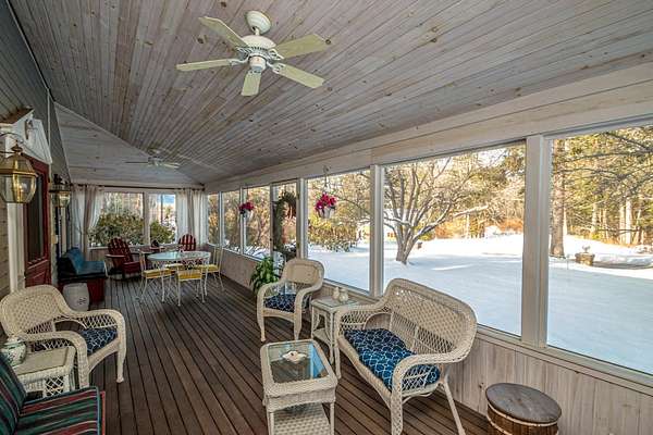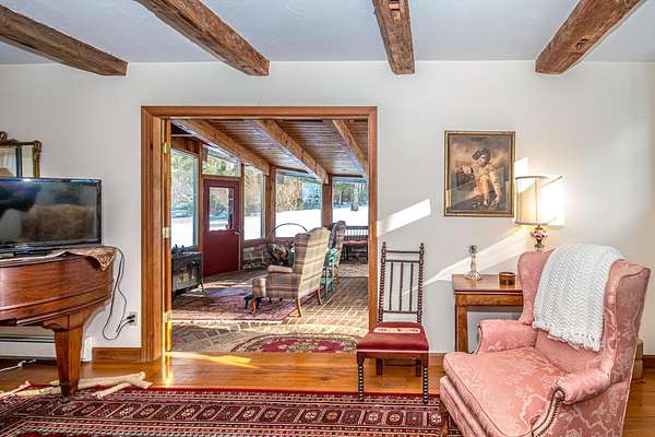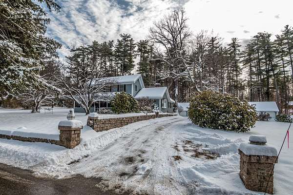 Nestled on 1.69 picturesque acres bordered by stately stone walls and framed by blossoming trees and shrubs, this classic Intervale home seamlessly blends timeless charm with inviting modern comforts. Step inside to a warm country kitchen featuring a brick hearth with a Glenwood cook stove, a handsome built-in hutch, an island for meal prep and storage, and warm wood flooring. The traditional living room exudes character with a beamed ceiling, a beautiful cut granite wood-burning fireplace, and two accent windows showcasing original wavy glass. The cozy den offers a serene spot to unwind and enjoy peaceful views through a large picture window. Entertain with ease in the expansive sunroom, complete with radiant brick flooring, a Defiant wood-burning stove, and abundant space for gatherings. The 32' long screen porch is the perfect spot to spend lazy summer days. A driveway of fine ground ledge pack. For car enthusiasts or those who love to host, the 8+ car garage provides ample parking and storage, making this property the perfect retreat for comfortable living and memorable entertaining. 3 Bedrooms, 2 Baths, main level laundry, 2500 SF