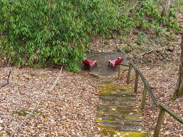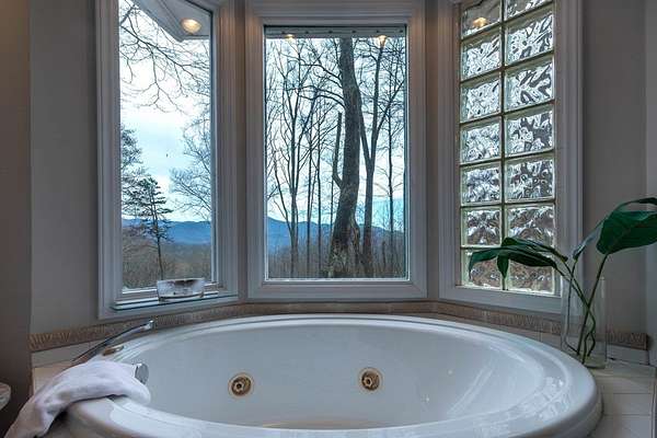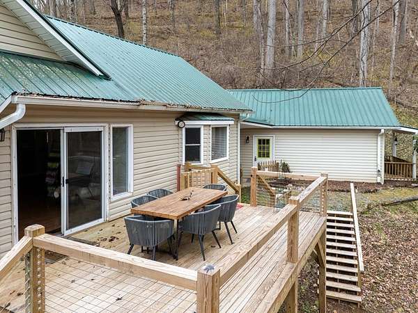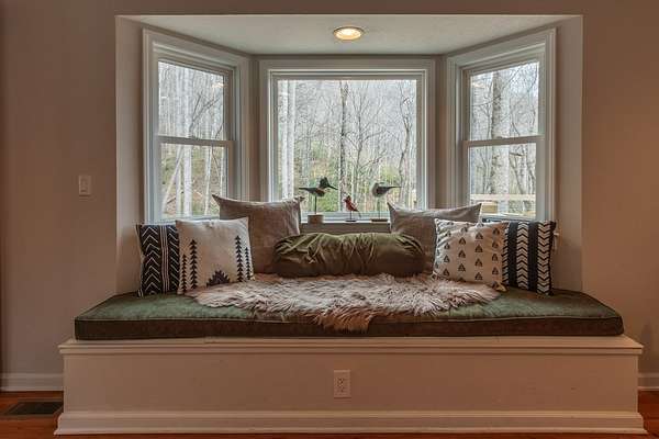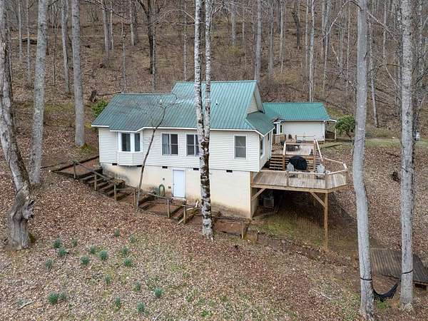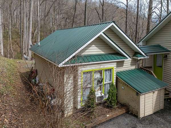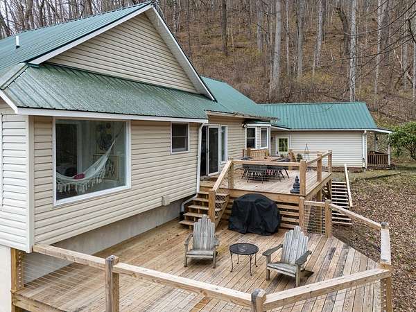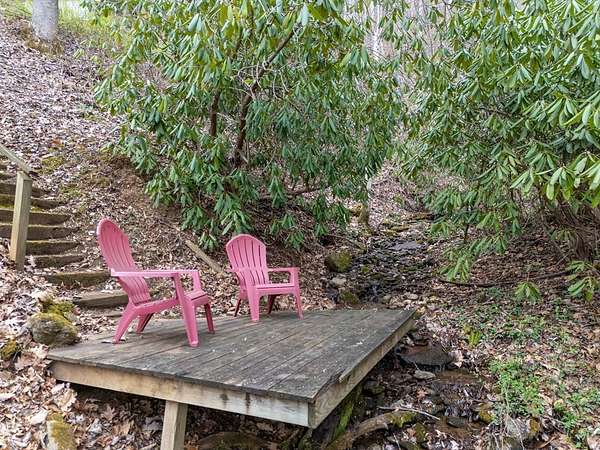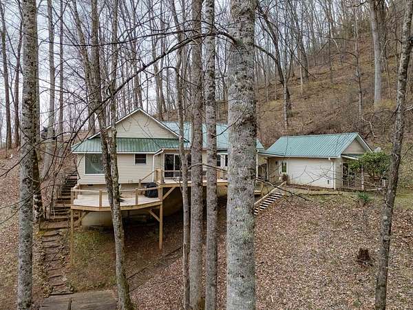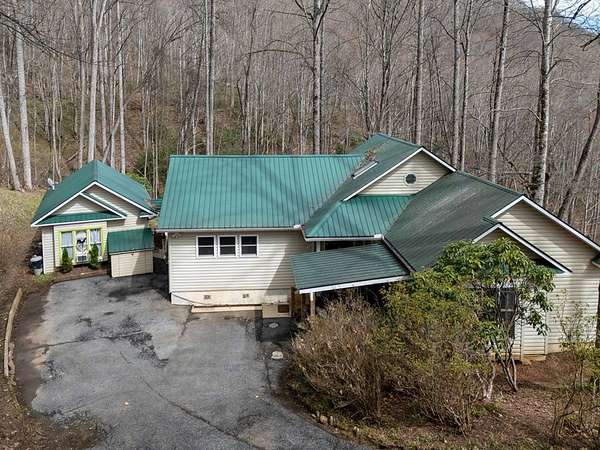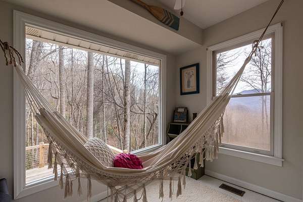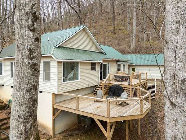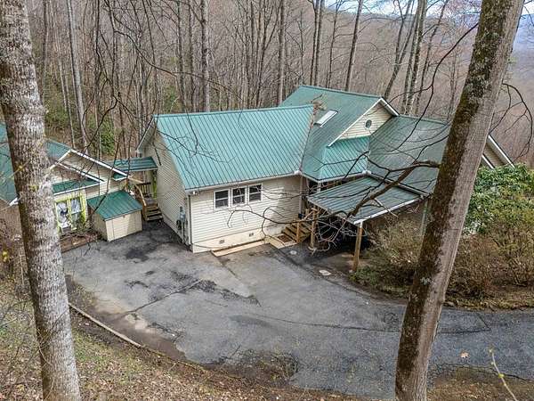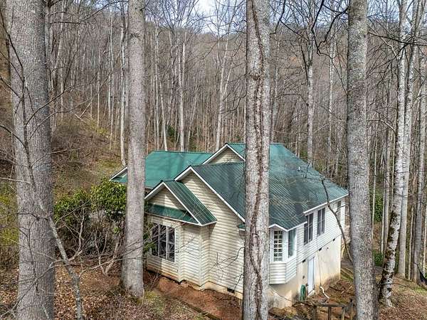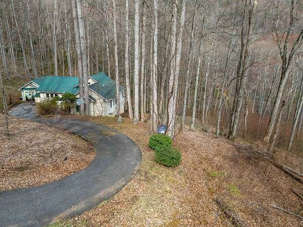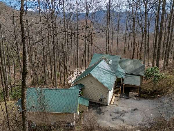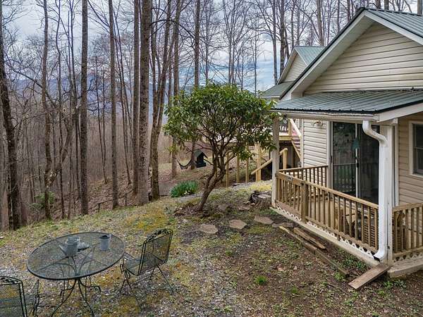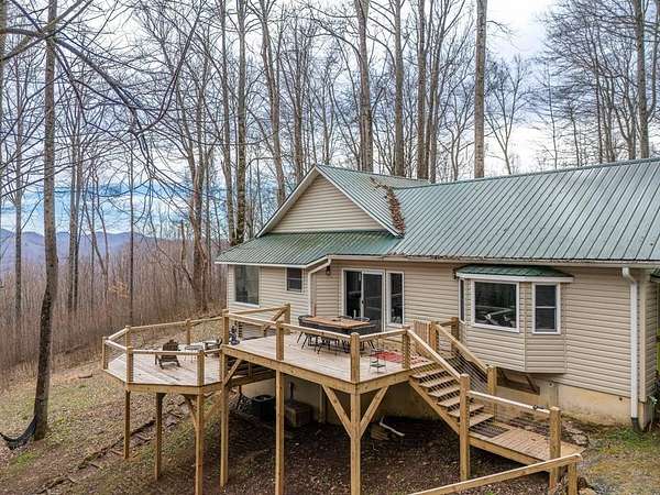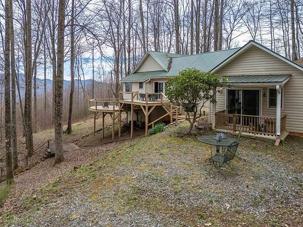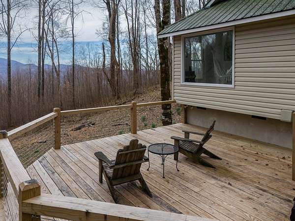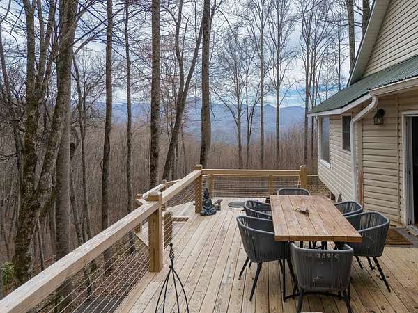 Located in the gated mountain community of Sylva Vista near Sylva, this private mountain retreat offers breathtaking views and peaceful natural surroundings. The community features paved and gravel roads, along with creeks and streams that wind through the landscape. As you arrive, nearly 360 mountain views greet you, while your own private creek provides the relaxing sounds of nature. Expanded decks and a fire pit create the perfect space to enjoy cool mountain mornings or evenings under the stars. Inside, the home welcomes you with an open dining area and vaulted ceilings. The kitchen offers a desirable space for making meals plus convenient bar for casual dining. The cozy living room features built-in bookshelves, fireplace, bay windows and reading nook, while the bright sunroom is ideal for a yoga room, office, or lounge. The primary suite includes large windows with mountain views and an ensuite bath with soaking tub and closet. A second bedroom offers a private bath for guests. A connected casita provides a studio layout with kitchen, bath, and private patio perfect for visitors. With mountain views, forestscapes, and a private creek, this home is a true mountain escape.