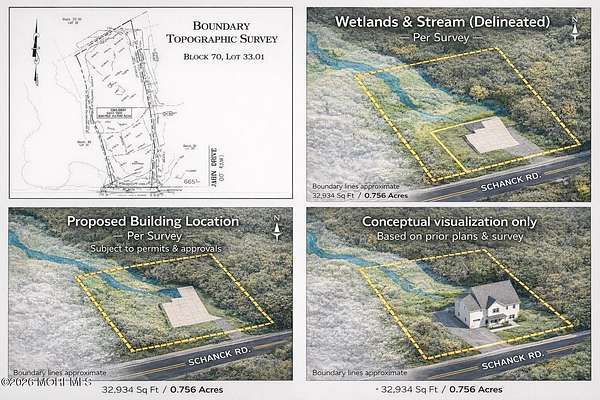 An excellent opportunity to build your custom home on a wooded lot in Freehold Township. Ideally located near Route 9, the property offers convenient access to shopping, dining, major highways, schools, parks, and local amenities. Public utilities-including water, sewer, gas, and electric-are available at the street for a more streamlined development process. The lot is suitable for a 1,468 sq. ft. home; however, a flood permit is required due to a stream on the property. A variance is available for those seeking a larger home, with prior plans for a 2,900 sq. ft. residence. The property features delineated wetlands and a scenic stream, adding natural appeal while requiring additional planning and permits. Be sure to view the video tour with drone footage.