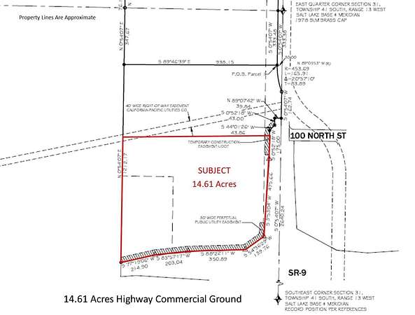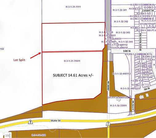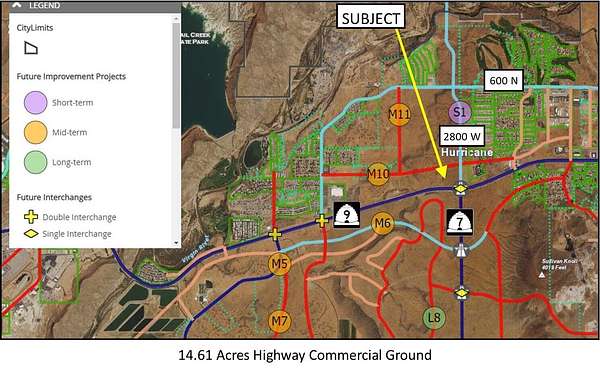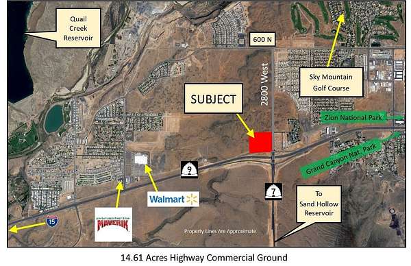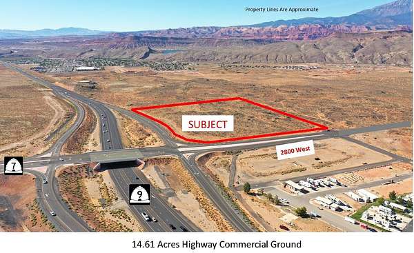 Approx. 14.61 acres zoned Planned Commercial ground or multi-family residential. High visibility, located on SR-9 and intersection of SR-7. Adjacent to the newly completed 2800 W by-pass to 600 North corridor. See ''Documents''. Near Walmart. High exposure and easy on/off highway access. SR-7 is Southern Parkway that runs adjacent to Sand Hollow Reservoir, STG Airport, and connects to I-15 at Exit 2. Annual Average Daily Traffic count at SR-9 is 42,000 vehicles/day. Lot split from parcel H-3-1-31-1101. Taxes are prorated estimate. Adjacent 9.34 acre parcel available MLS 25-258514. Acreage is an estimate. Final acreage determined by lot split as approved by the City.