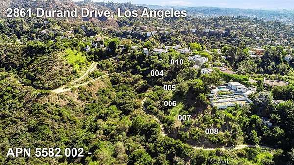 Spectacular building sites on the Durand Drive ridgeline in Beachwood Canyon. The property consists of 6 contiguous lots (1.57 acres, 68,250 SF, separate APN's) with excellent views of the Hollywood sign, Lake Hollywood Reservoir, and Downtown Los Angeles. Downsloped from the street for a truly spectacular hillside custom home project with an extensive amount of land, rare for the Hollywood Hills. The entry lot has a flat area at the street level; homes on either side are in the multi-million dollar price range. This is a rare opportunity to build a large view home or more with plenty of land for gardens, trails, a dream compound within the scenic and famous Hollywood Hills. The views and exquisite natural surroundings are at your doorstep, offering the perfect setting for a stellar property. Hiking trails are adjacent, including the nearby circuit around the Hollywood Reservoir (3.5 miles, flat and serene) and more adventurous hikes up the hills and trails. It is a few blocks from the Beachwood Canyon Market and the Cafe and a short distance to commute to several major studios. These include Netflix, Universal, and Hollywood's famed production sites. It is your peaceful retreat in the Hills, and minutes from Hollywood. Several nearby properties are in the $10M and more range. This 6 lot package is fit for a compound estate, or multiple homes, and presents a once-in-a-lifetime opportunity. City utility services are in the street; prestigious homes are on either side of this land on one of the best streets in Beachwood Canyon.