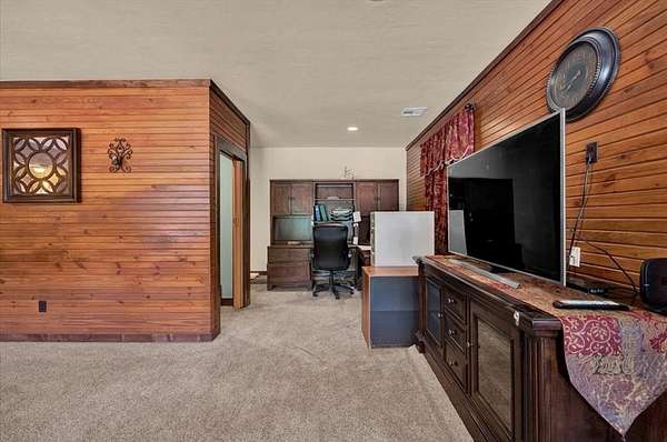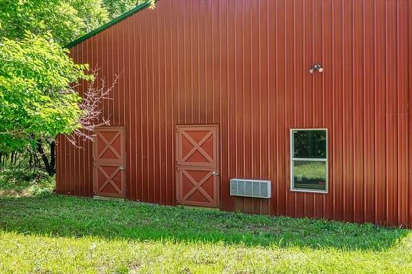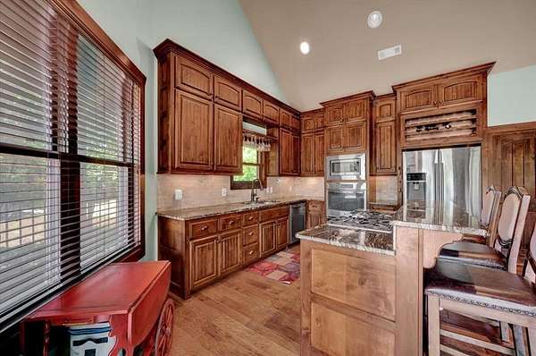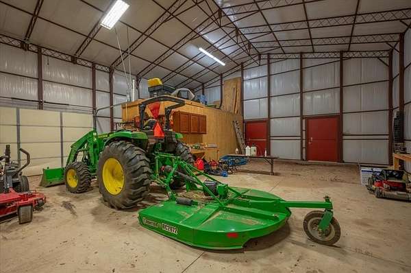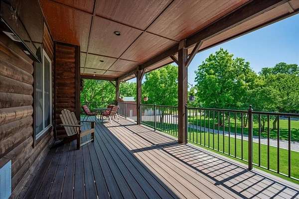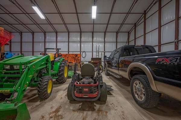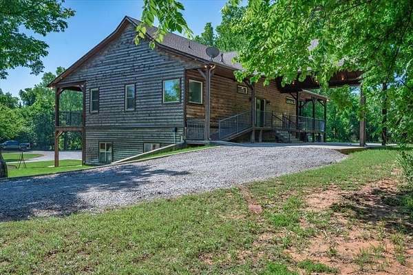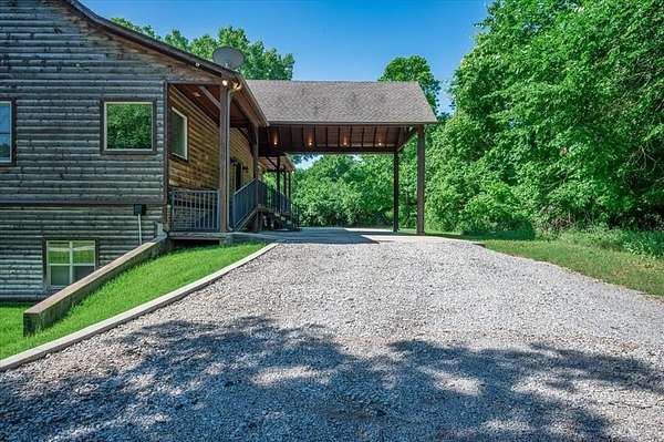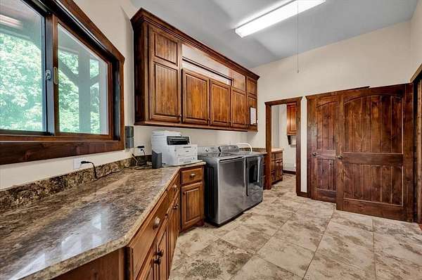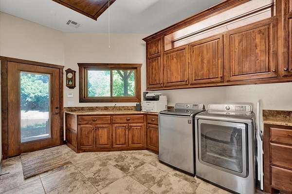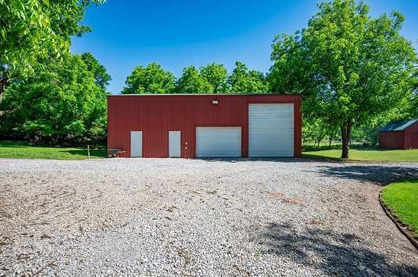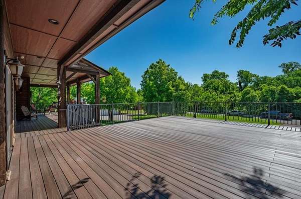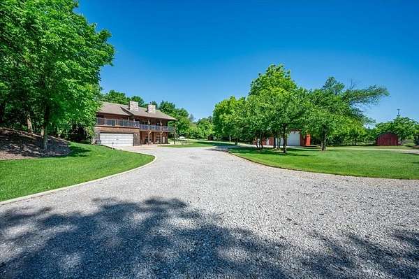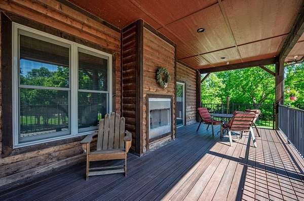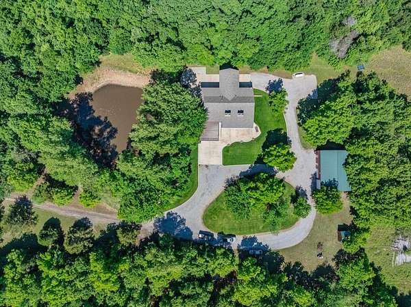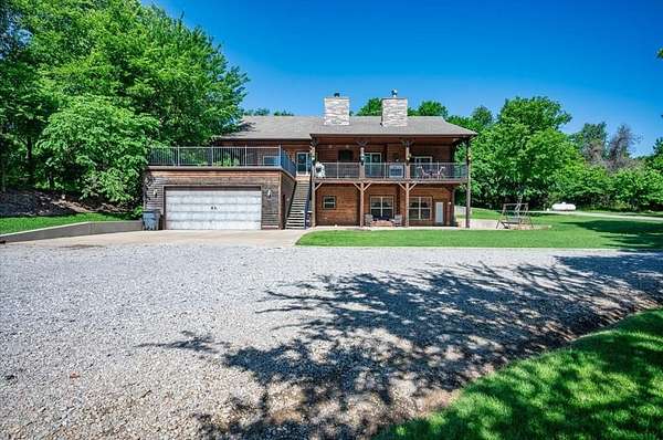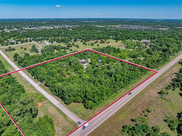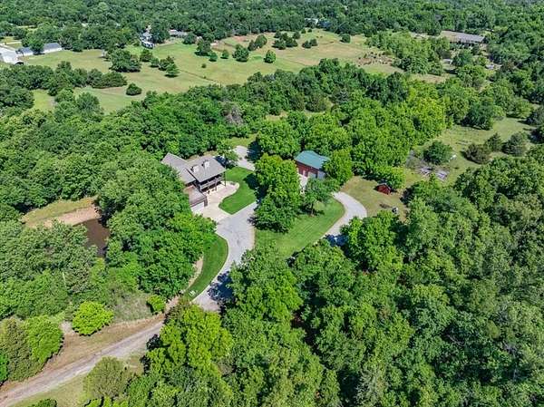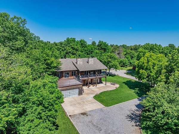 Welcome to one of North Edmond's most distinctive & private residences, a custom-built, 1 owner log-style estate on 10 wooded acres (MOL) just off Coltrane, minutes from Waterloo's growing development yet worlds away in peace & quiet. Reminiscent of a mountain or lakeside retreat, this log-cabin-style home blends rustic luxury & multigenerational versatility, featuring wood log siding, a seasonal pond at the entrance, & a tree-lined drive opening to a circular motor court. Designed as 2 fully equipped residences, the lower level offers a spacious living room w/ office nook, full kitchen w/ breakfast bar, master suite w/ laundry & garage access, & an earth-sheltered safe room bath complete w/ jacuzzi tub & shower combo + steel safe doors. Upstairs, soaring cathedral ceilings & hand-scraped oak floors set the tone for a 2nd open-concept space featuring a full kitchen w/ gas range island, wine glass storage, granite counters, pantry, & large living room w/ stone fireplace. Multiple doors open to the expansive wraparound TREX deck w/ forest views, built-in fireplace, & pre-wired hot tub pad above the garage. The upstairs suite includes private deck access, a spa-like bath w/ dual vanities, walk-in shower, corner jacuzzi tub, & 2nd walk-in closet. A 2nd laundry/mudroom, full bath, & rear entry through a two-story porte cochere designed for RV parking complete the upper level. The home is connected by interior & exterior staircases, + an accessible ramp--perfect for guests, parents, or independent adult children. A 60x40 steel shop adds major value w/ large RV door, 2 garage bays, framed paddock doors, pre-wired RV hookups, & a climate-controlled flex room w/ full bath for a guest suite, tack room, or workshop. The slab in the barn area is inset & ready to be built out for horse stalls. Surrounded by mature trees, nature & total privacy on a secluded low-traffic road, this is a rare sanctuary for those seeking space, luxury, & flexibility without sacrificing convenience.