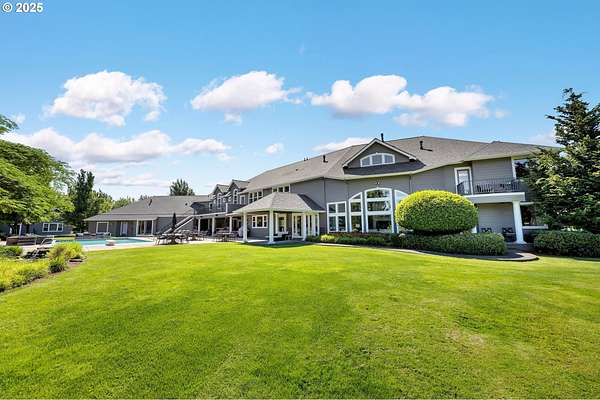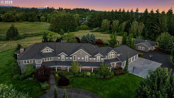 Private tree lined drive leads your guests to this stunning 6.53-acre Cape Cod Estate. A retreat designed for comfort, elegance, and unforgettable moments. Two Primary Suites! Main level suite features gas fireplace w/ cherry cabinetry surround & two spacious walk-in closets w/ built ins. Upper-level 2nd primary w/ vaulted beamed ceilings, gas fireplace, flex space w/ bayed window & spacious walk-in closet. 5 additional bedroom suites upstairs including gym/yoga room w/ balcony, spacious laundry room, storage room & back staircase. Second level guest quarters w/ separate entrance, kitchenette, vaulted bedroom, full bath & private balcony. Two story formal living w/ floor to ceiling windows, gas fireplace w/ marble surround. Main level office w/ built-in desk offering three workstations, built-in bookshelves & closet. Chef's kitchen features cherry cabinetry, 6 burner Viking range, expansive solid granite workspace & island w/ bar seating for 7, two dishwashers, built-in kitchen desk & large walk-in pantry. Gorgeous formal dining features cherry boxed beam ceiling, gas fireplace w/ cherry built-ins & French doors to covered patio. Great room w/ bay window and built-in cherry cabinetry is an entertainers dream. Double sliders open to beautiful outdoor covered entertaining w/ bar, infrared BBQ, outdoor fireplace & 1000 sf pool w/ spa. 4 zone HVAC w/ newer A/C units. New 50-year roof. Newer exterior paint. 5 car oversized garage w/ built-in cabinetry & epoxy flooring. Separate 1196 sf guest house/office features kitchenette, bedroom & full bath plus several flex spaces & one car garage.