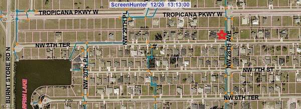 North on Burnt Store Rd N, right on Tropicana Pkwy W, right on NW 28th Ave, right on NW 7th Ter, property is on the corner of 7th and 28th.
