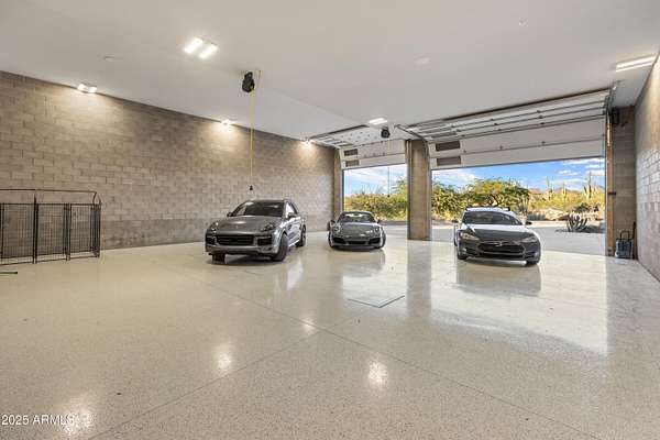 Stunning Industrial-Modern Estate on 4.7 Private Acres. Clean lines & top-quality block construction define this exceptional property, featuring floor-to-ceiling windows w/ breathtaking mountain and city light views. The 4 bed, 4.5 bath main house offers open-concept living, beautiful patio & a 4-car garage. A separate 3 bed, 4 bath guest house includes a private entrance, an impressive 10-car RV/collector garage & a 800 bottle climate controlled wine room. Set in total privacy with panoramic desert scenery, this one-of-a-kind multi-generational estate delivers architectural beauty, luxury, and lifestyle at the highest level. Make this 8,2023 sf home with a 3,100sf garage a must-see for any person who loves quality construction, privacy, estate quality finishes & luxury w/stunning views.