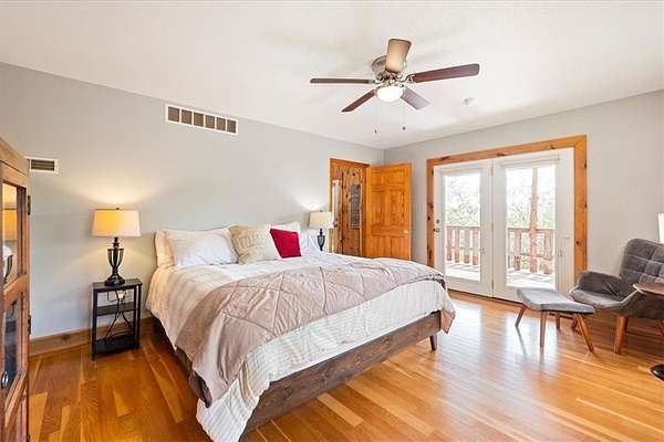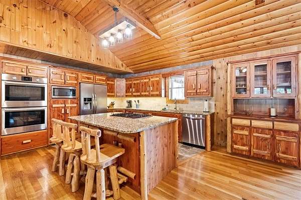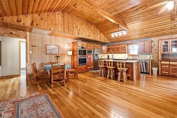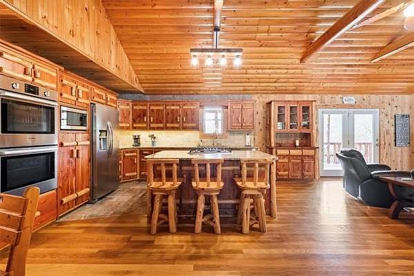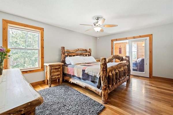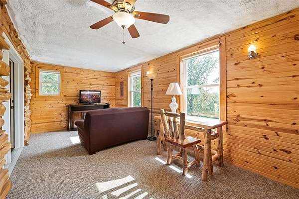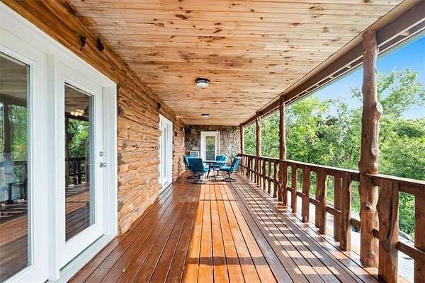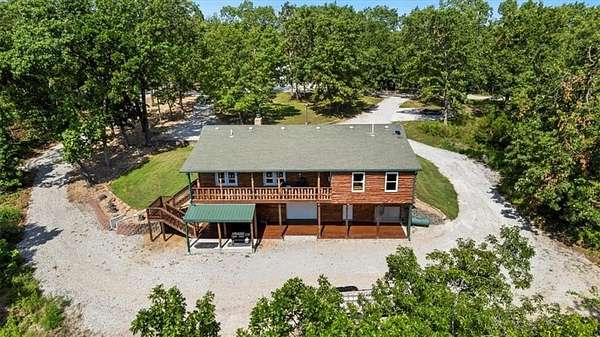 Dreaming of a lake get away? Welcome to this beautifully maintained 2-bedroom, 2-bath cedar log-sided home on approximately 8 acres, nestled on a serene lot that backs up to core land of Truman Lake. Whether you're looking for a weekend getaway, full-time retreat, or lake lover's dream, this property offers the perfect blend of privacy, comfort, and functionality. Selling fully furnished - as turn-key as they come, step inside and you'll be greeted by cedar walls, gleaming hardwood floors, and a stunning stone wooden fireplace. The updated kitchen is both stylish and functional, featuring double ovens, gas stove, granite countertops, custom cabinets, tile backsplash, and newer stainless steel appliances. Laundry is located on the main level. Both bedrooms are generously sized with large closets and updated bathrooms that include tiled flooring and spacious walk-in showers. One bedroom offers direct access to the back deck, perfect for enjoying your morning coffee with a view. Enjoy outdoor living with a covered front porch and a large covered back deck overlooking peaceful woods and wildlife. The basement offers the potential for additional living space or ample storage for lake gear, ATVs, or hobbies. The property includes a 30x40 Quonset outbuilding with concrete floors and electricity, plus multiple pole barns, ideal for storing boats, equipment, or working on your next project. The pole barn directly behind the outbuilding has electricity running to it as well. Property is own it's own private well. Find mature Hickory, Oak, and Cherry trees throughout the timber. Located minutes away from restaurants, boat rentals, motels, RV parks, marina/boat slips, and more! This property is a must see!