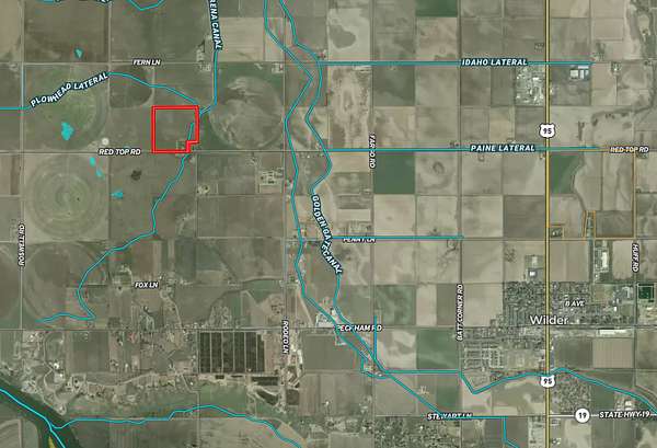 Wilder lies in the fertile Treasure Valley, a broad agricultural area shaped by the Snake River. The landscape is mostly flat to gently rolling farmland, with irrigation canals and fields of crops like onions, corn, alfalfa, and hops.