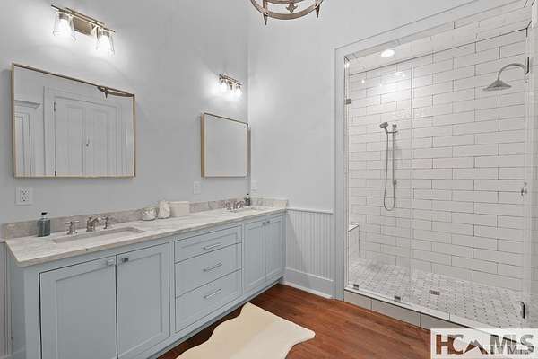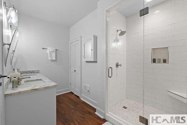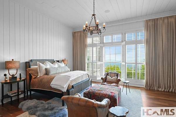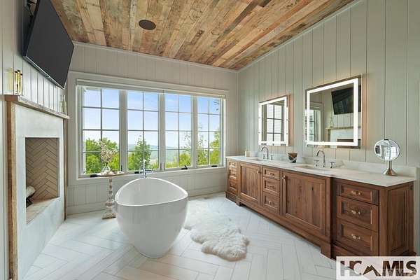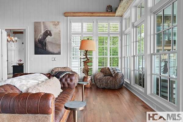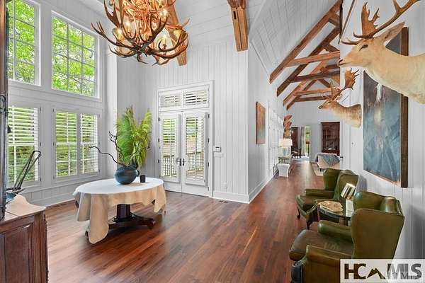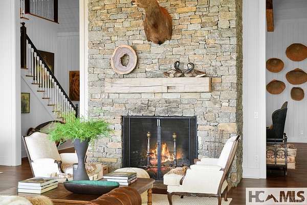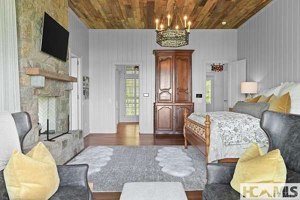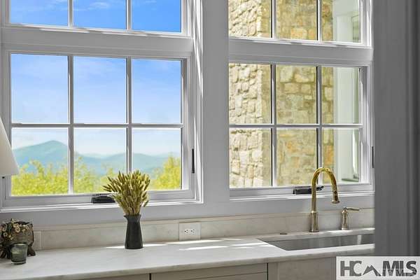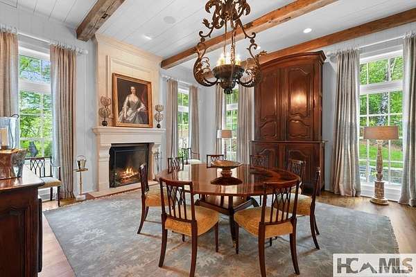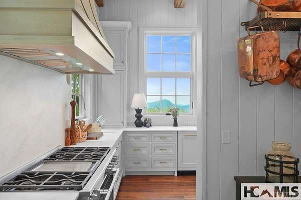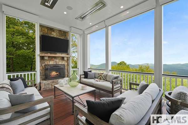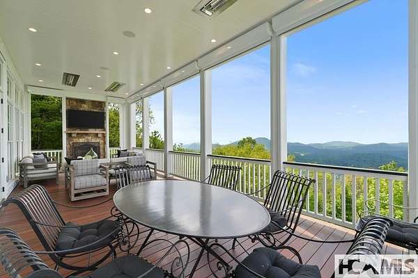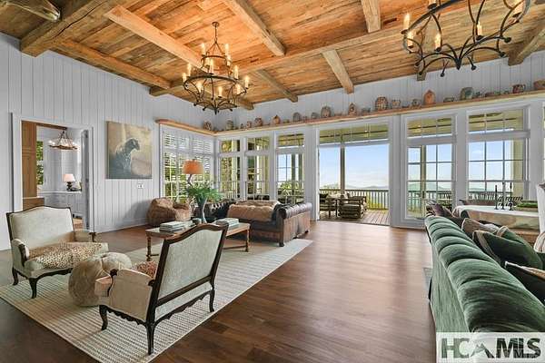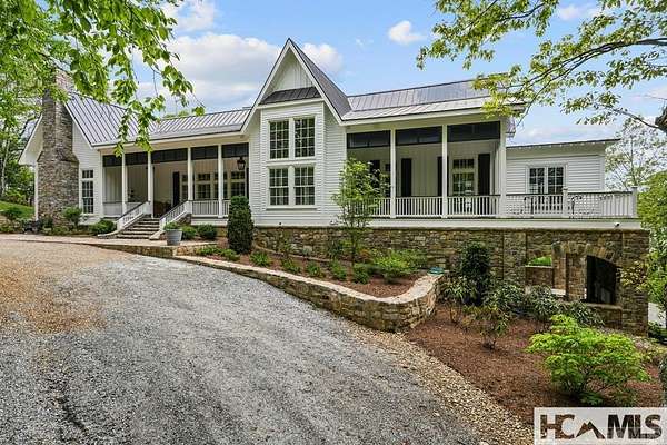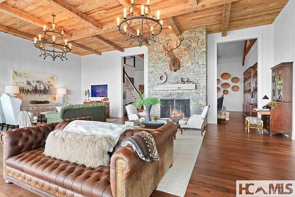Perched high above Cashiers at over 4,500 feet, this extraordinary estate offers a rare chance to embrace the very best of mountain living. Commanding over six private acres within the gated community of Big Sheepcliff, the property showcases sweeping vistas that stretch across Cashiers and into South Carolina and Georgia, all just minutes from town. Meticulously remodelled from top to bottom, the residence blends timeless elegance with modern luxury. Antique timber accents infuse warmth and authenticity throughout, while majestic masonry fireplaces anchor the expansive great room, family room, and formal dining room. The chef's kitchen, with its generous scale and top-of-the-line appliances, is ideal for both everyday living and elegant entertaining. The main-level primary suite is a serene retreat, featuring a double-sided fireplace that warms both the bedroom and the lavish bath, along with a private porch to enjoy the views. A generously sized guest en-suite on this level also boasts sweeping mountain views. Two separate upstairs wings of the home offer private guest or family accommodations featuring private sitting rooms, large bedrooms and en-suite bathrooms. Beyond the home, there is ample land to build a guest house and complete a true family compound. For the outdoor lover, stone patios, terraced stone gardens, a spacious Carolina porch centered on a fireplace, a grilling terrace, and a stone firepit sitting area all invite you to savor cool mountain breezes and unforgettable long-range views. Every detail reflects refined mountain living-private, timeless, and filled with natural beauty.