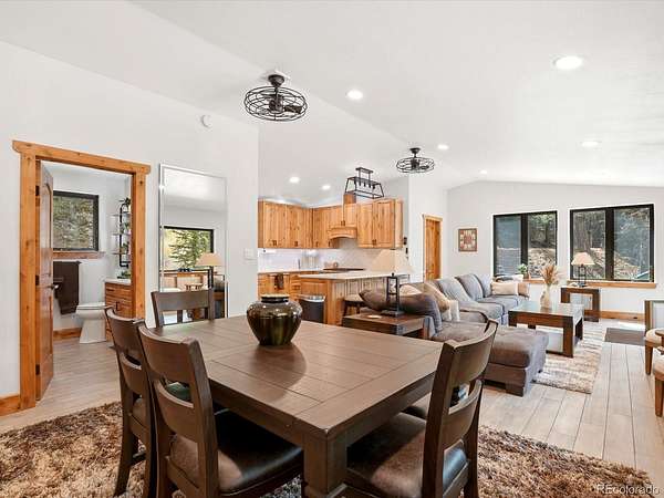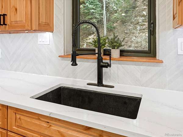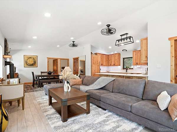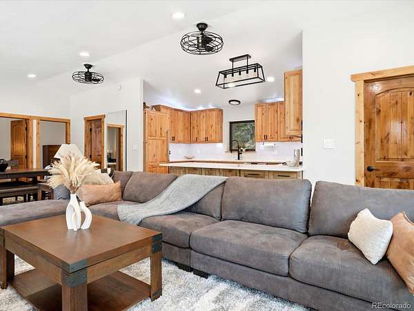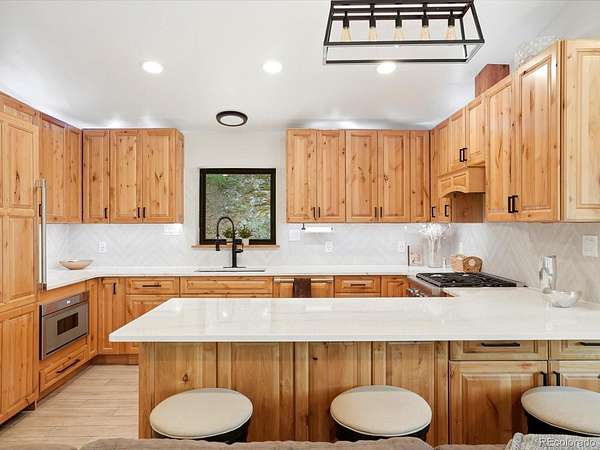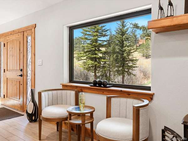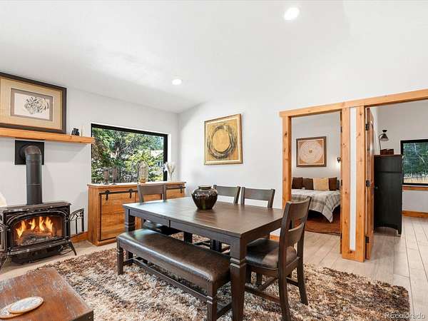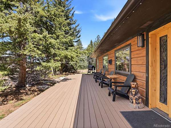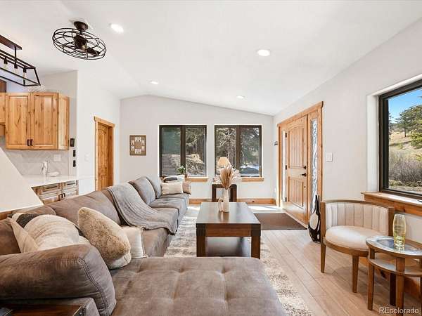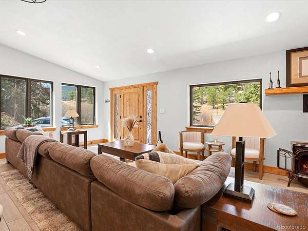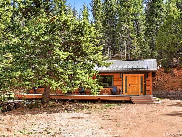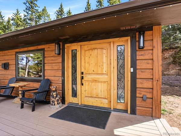 Experience elevated mountain living in this beautifully reimagined Conifer cabin sitting on over 2 acres where every detail reflects a top to bottom renovation completed with uncompromising quality. No expense has been spared in creating a home that blends modern luxury with the warmth and charm of a classic retreat. Set against a backdrop of stunning mountain views, the property invites you to slow down and soak in the surroundings from the expansive new composite deck that spans the full length of the home, perfect for morning coffee, sunset gatherings, or quiet evenings under the stars. The exterior showcases new concrete siding, a durable metal roof, new gutters, and energy efficient spray foam insulation, offering both peace of mind and year round comfort. A solid wood front door with custom iron detailing creates a memorable first impression. Inside, the home has been completely transformed into a light filled, inviting space anchored by a cozy wood burning stove in the living area. The thoughtfully designed kitchen features 42 inch cabinetry, built in Thermador appliances, a gas range, quartz countertops, hidden kick drawers, soft close cabinets, and elegant lighting above and below the cabinetry complemented by a stylish tile backsplash. The bedrooms feel open and airy with vaulted ceilings and abundant natural light, while the bathroom and both bedrooms are enhanced with in floor radiant heating for added comfort along with a sleek anti fog mirror. Whether you are seeking a peaceful full time residence or a weekend escape, this cabin offers a seamless blend of luxury, efficiency, and natural beauty designed to be enjoyed in every season.