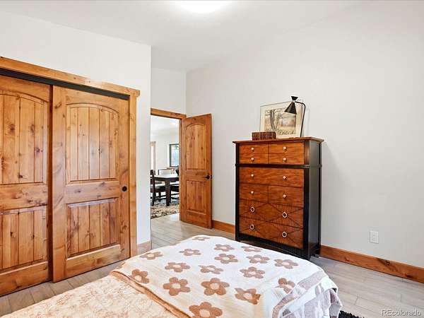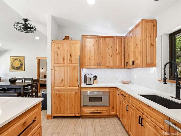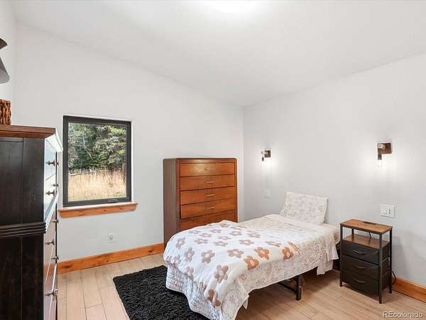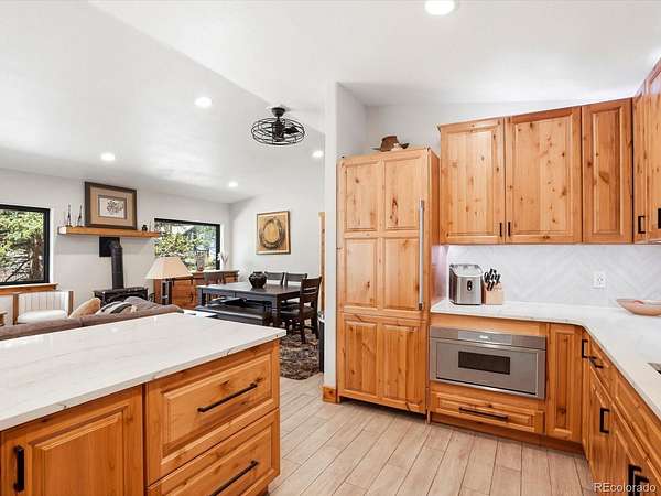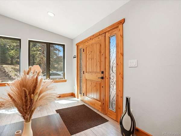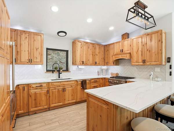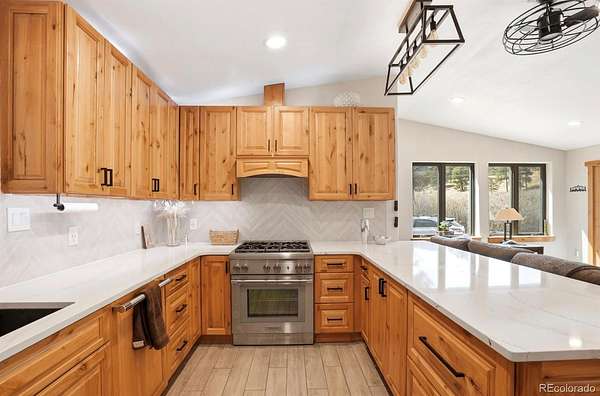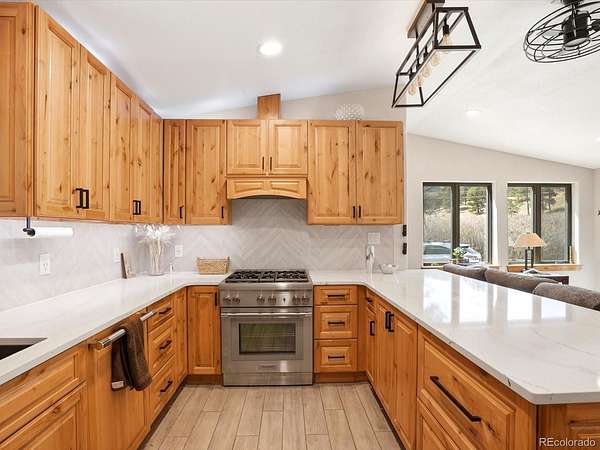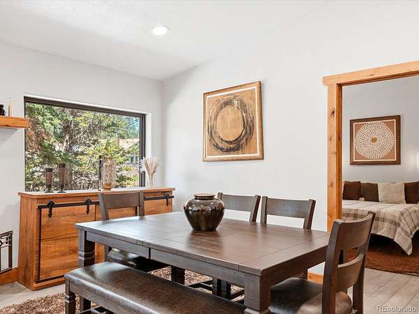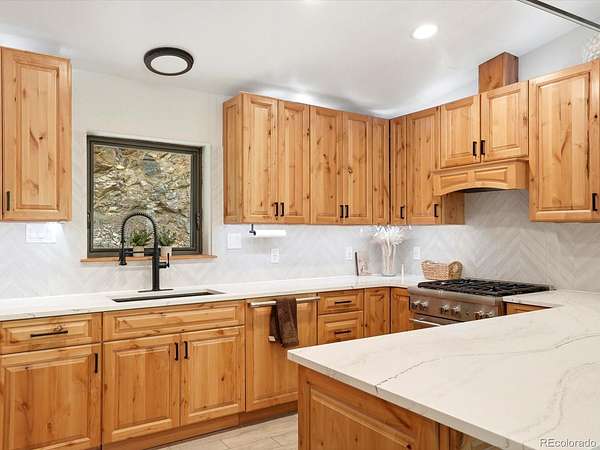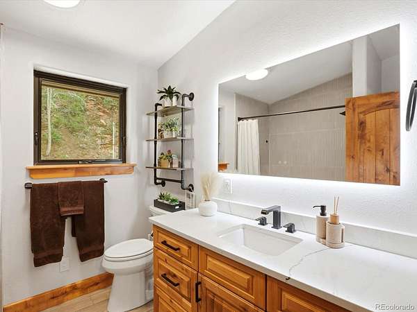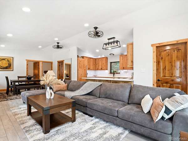 Experience elevated mountain living in this beautifully reimagined Conifer cabin sitting on over 2 acres where every detail reflects a top to bottom renovation completed with uncompromising quality. No expense has been spared in creating a home that blends modern luxury with the warmth and charm of a classic retreat. Set against a backdrop of stunning mountain views, the property invites you to slow down and soak in the surroundings from the expansive new composite deck that spans the full length of the home, perfect for morning coffee, sunset gatherings, or quiet evenings under the stars. The exterior showcases new concrete siding, a durable metal roof, new gutters, and energy efficient spray foam insulation, offering both peace of mind and year round comfort. A solid wood front door with custom iron detailing creates a memorable first impression. Inside, the home has been completely transformed into a light filled, inviting space anchored by a cozy wood burning stove in the living area. The thoughtfully designed kitchen features 42 inch cabinetry, built in Thermador appliances, a gas range, quartz countertops, hidden kick drawers, soft close cabinets, and elegant lighting above and below the cabinetry complemented by a stylish tile backsplash. The bedrooms feel open and airy with vaulted ceilings and abundant natural light, while the bathroom and both bedrooms are enhanced with in floor radiant heating for added comfort along with a sleek anti fog mirror. Whether you are seeking a peaceful full time residence or a weekend escape, this cabin offers a seamless blend of luxury, efficiency, and natural beauty designed to be enjoyed in every season.