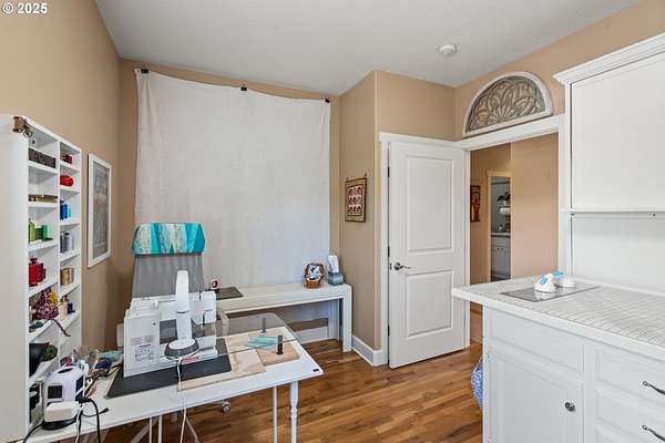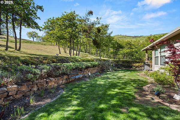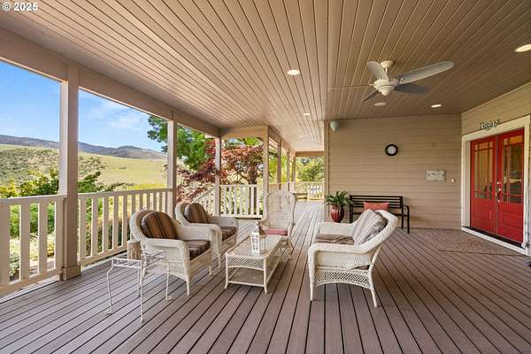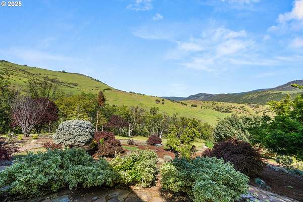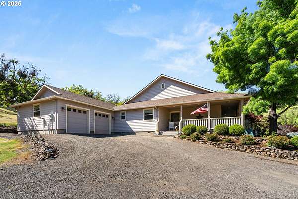 Experience refined country living on just over 23 acres of rolling green hills, and panoramic mountain views. Immaculately maintained, this exceptional home welcomes you with a wide covered porch, perfect for taking in serene vistas from sunrise to sunset. Inside, beautiful hardwood floors flow throughout the open-concept design. The vaulted great room features a striking fireplace and expansive windows that bring the outdoors in. The gourmet kitchen is a showpiece, complete with sleek granite countertops, an island with seating, stainless steel appliances, and seamless flow to the formal dining room, which shows off custom built-in cabinetry and a door to the patio for effortless indoor-outdoor entertaining. The spacious primary suite is thoughtfully placed at one end of the home, featuring a walk-in closet, luxurious bath with double sinks and walk-in shower, a door to the back patio, plus a private exercise room. Two additional bedrooms and a full bath with a jetted tub and shower are located at the opposite end for privacy and comfort. A dedicated office with custom built-ins and a fully equipped laundry room with sink and storage add everyday convenience. The oversized two-car garage includes a workspace and half bath, with an adjacent mudroom entry. A designated RV parking area with hookups enhances the property's versatility. Outside, enjoy a covered patio, manicured garden areas, and a full sprinkler system, all set against a backdrop of nature's finest. This is a rare opportunity to own a peaceful retreat that's just minutes from hiking trails, dining, 2 wineries, and Emigrant Lake County Park for camping, fishing, and swimming. Just 8 minutes from the shopping center. A true slice of paradise without sacrificing proximity to modern amenities.