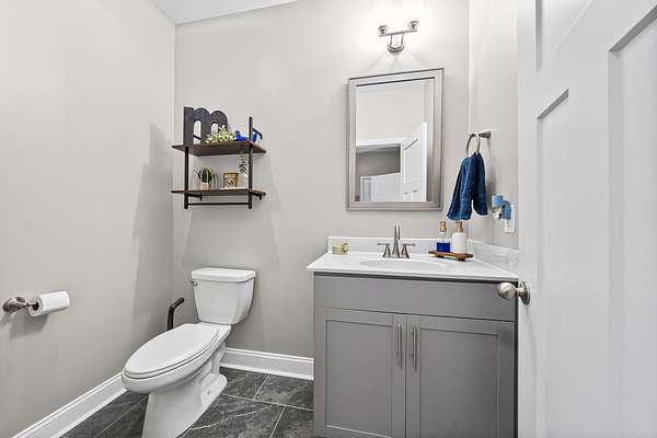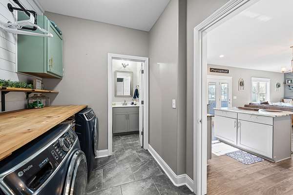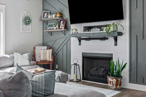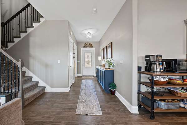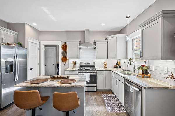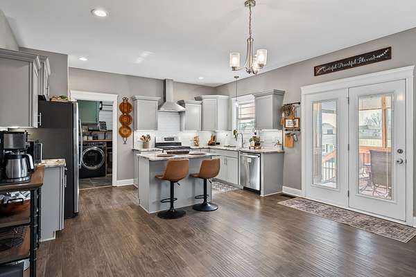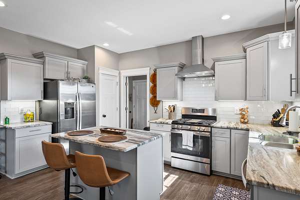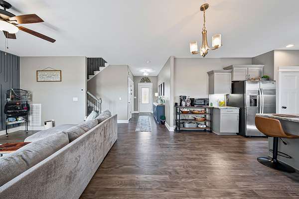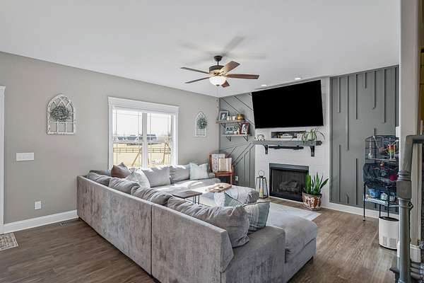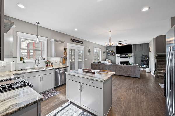 Inside, the entire first floor is dedicated to everyday living, featuring an open-concept layout designed for comfort and gathering. The chef's kitchen includes abundant cabinetry, granite countertops, a gas range with range hood, and a large island--perfect for home-cooked meals and entertaining. The living area is warmed by a gas fireplace, creating a cozy, welcoming feel, while custom blinds throughout add style and privacy.