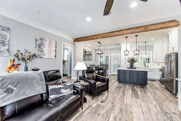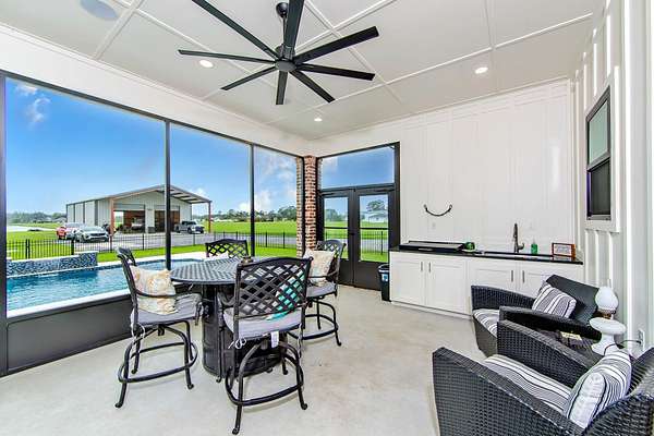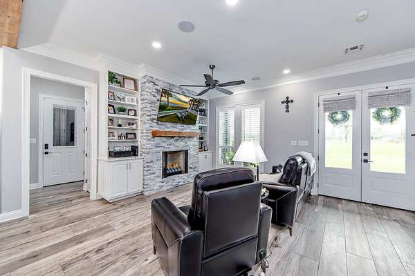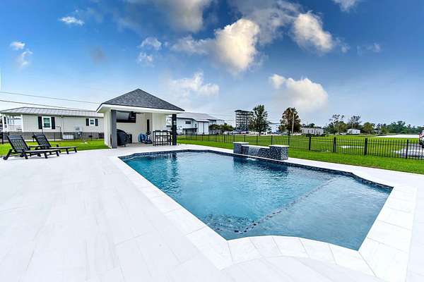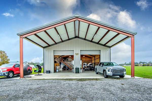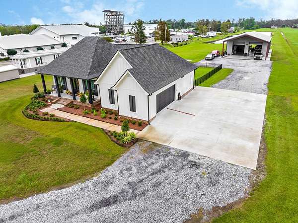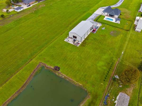 Welcome to this breathtaking property set on over 7 acres of beautiful countryside. Built in 2023 by Travis Buquet, this custom home perfectly blends upscale living with everyday comfort. Featuring 3 generously sized bedrooms, 2 beautifully designed bathrooms, and an open-concept layout, the home is ideal for both relaxing and entertaining. The kitchen is a true highlight, complete with quartz countertops, a pot filler, and a sleek built-in microwave drawer. Step outside and enjoy your own private retreat featuring a saltwater inground pool with varying depths-3.5 feet along the ledge, 4 feet near the in-pool stools facing the gazebo, and 5 feet at the center-perfect for both lounging and cooling off. The outdoor space also includes a gazebo with a half bath and a covered patio equipped with a built-in gas stove and granite sink, making it ideal for hosting gatherings. The fenced-in pool area and front yard are both equipped with an irrigation system, helping maintain the lush landscaping with ease. Additional features include a high-end security system with cameras, a stocked 2-acre pond for fishing and relaxation, and a massive 40x60 shed with a 20x40 overhang. The shed includes a full bathroom, closet, washer and dryer, and ample storage-ideal for hobbies or workspace. A 26KW natural gas generator and added 14x60 lean-to provide even more functionality. Located outside the flood zone, this property does not require flood insurance. Enjoy peaceful country living with all the modern upgrades you could ask for. (Buyer to verify and confirm sq ft of home and property and also flood zone designation).
