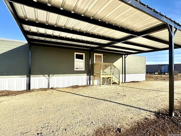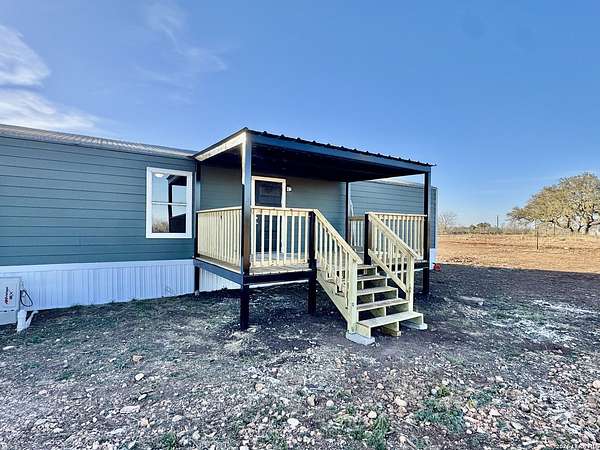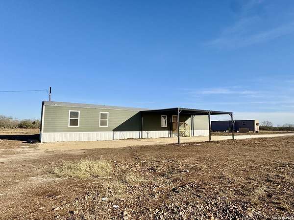 Move-In Ready Home in Devine, TX! Situated on 4 Acres this property includes a guest house, city water and road frontage. Rare opportunity to own a move-in ready manufactured home on 4 unrestricted acres in the peaceful countryside, conveniently located near San Antonio. The main residence is a 1,200 sq. ft manufactured home featuring 3 bedrooms and 2 full bathrooms, complemented by a converted container guest house with 1 bedroom and 1 bathroom, the ideal spot for extended family, guests, rental income, or a private office. Don't miss out on the large covered front carport, a spacious covered back porch, city water, septic system, and excellent road frontage on a paved county road. The land is unrestricted with no HOA, offering flexibility for personal use or future expansion. With subdivision potential into 1-acre lots (buyer to verify), this property provides both immediate livability and long-term benefits. Enjoy privacy, open space, and the freedom of country living while remaining within easy reach of San Antonio and surrounding communities! Schedule a showing today and be one step closer to owning a piece of Texas!