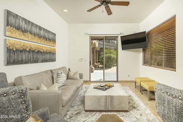 Redesigned in 2020 for primarily single-level living, this fully furnished estate features light-filled interiors and seamless indoor-outdoor flow with resort-style outdoor spaces, pool, spa, and sweeping valley and city-light views. The main level blends open gathering areas with private rooms for work, media, and relaxation, while a secondary primary suite, den, and game room upstairs offer flexibility for guests or multi generational living. Set on 3.8 acres within a gated community and bordered to the north by 11 acres of HOA-owned open land, the property offers exceptional privacy and scale. A private one-bedroom casita, detached 1,815-sf auxiliary building, and 10-car garage complete the estate embracing expansive desert valley views. The kitchen blends refined design with high performance, anchored by a curated appliance suite and a 200-bottle, glass-walled, temperature-controlled wine cellar that becomes part of the architecture. A linear gas fireplace wrapped in natural stone adds a sculptural focal point, elevating both everyday living and evening entertaining. Designed for hosting, the media room features custom cabinetry and a sleek bar topped with a waterfall quartzite countertop that invites conversation. Glass sliders open directly to the infinity-edge pool and spa, creating a seamless indoor-outdoor connection. Two dedicated offices or dens further support today's work-from-home lifestyle and multigenerational flexibility. The residence offers a total of six ensuite bedrooms, with a seventh flexible-use room discreetly positioned beyond the media room, ideal as a guest suite, wellness room, or private retreat. Fully furnished and ready to enjoy, this estate embraces the views and lifestyle that define North Scottsdale.