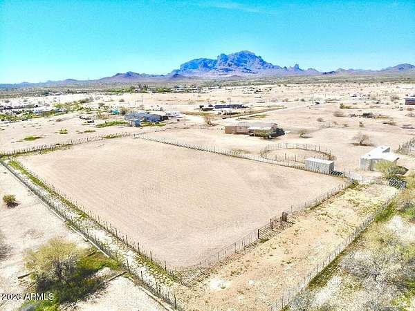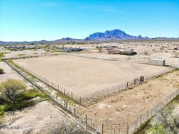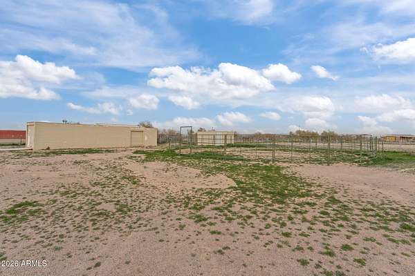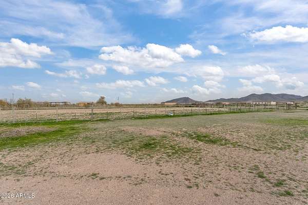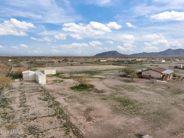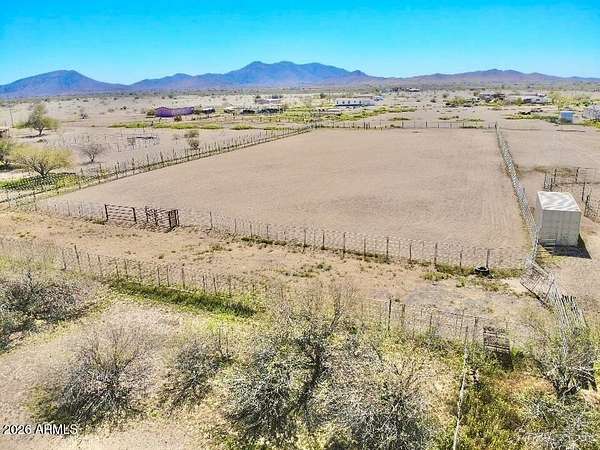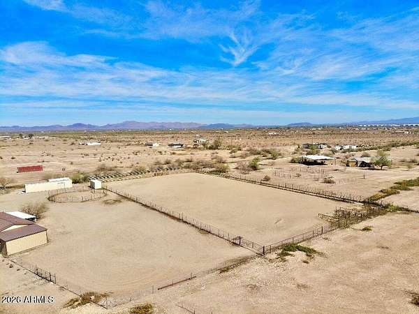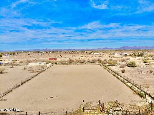 Located in Saddle Vista, this 5-bedroom, 3-bath home sits on 3 acres with a functional equine layout and thoughtful use of space. The home features an open floor plan with covered decks on both sides, taking in the desert landscape and Saddle Mountain views. Equine improvements include eight 14' x 30' pipe stalls, a 160' x 305' roping arena, a round pen, and two steer pens. The arena is designed for horseback operation with gates that open and close without dismounting. A 3,500-gallon tank, oversized pump, Rain Bird water system, and extended sprinkler heads allow the entire arena to be watered in approximately 36 minutes. Sellers have hauled in significant sand to elevate footing and enhance usability. Perimeter no-climb fencing surrounds the property... Two storage containers (8.5' x 20' and 8.5' x 53') offer space for tack, tools, or seasonal storage. The layout provides privacy, room for trucks and trailers, and direct function for ropers, barrel racers, or anyone seeking usable ground with improvements already in place. The property is approximately 30 minutes from Buckeye Equestrian Center and about 50 minutes from Wickenburg.