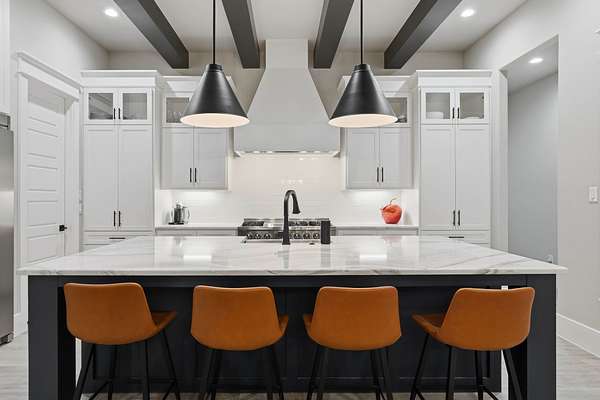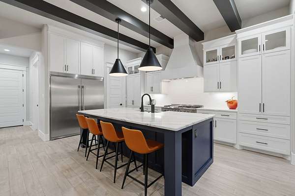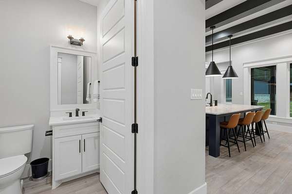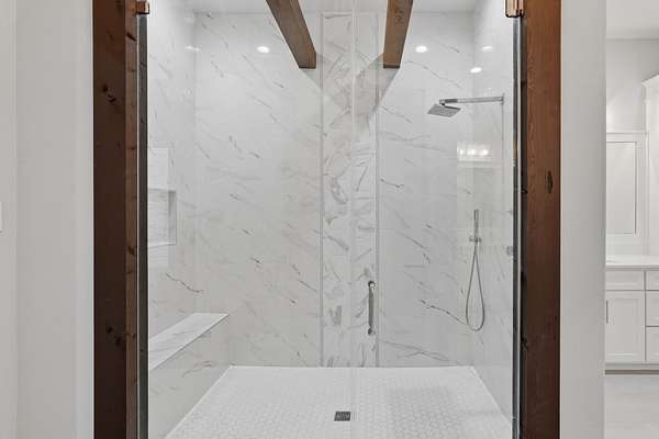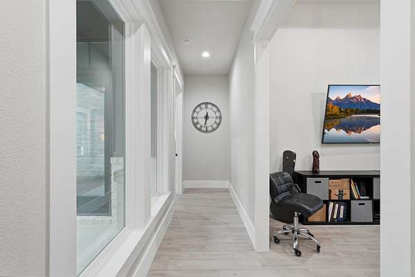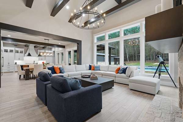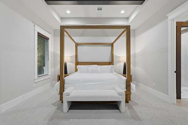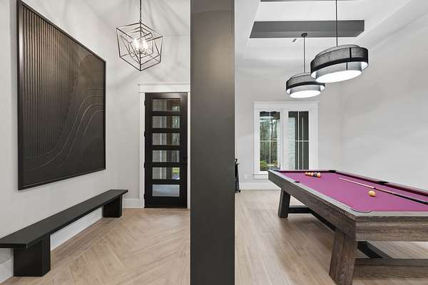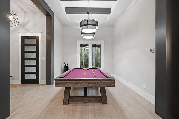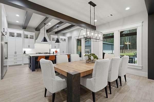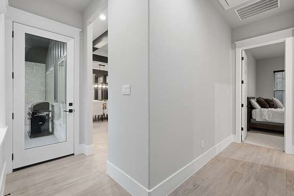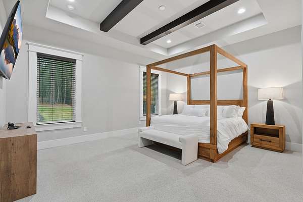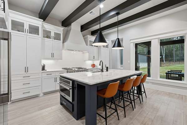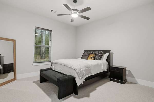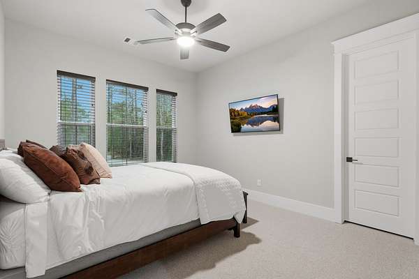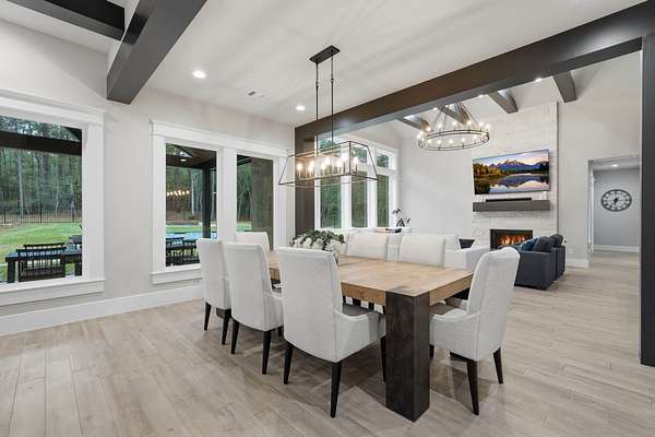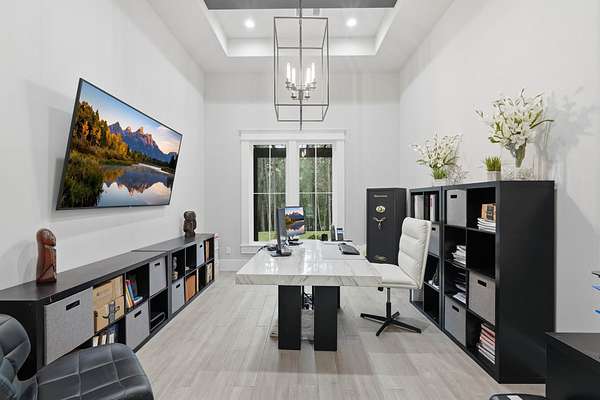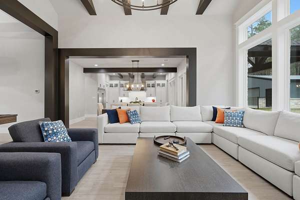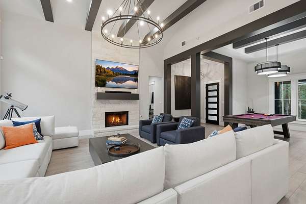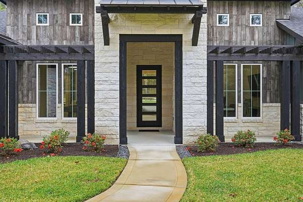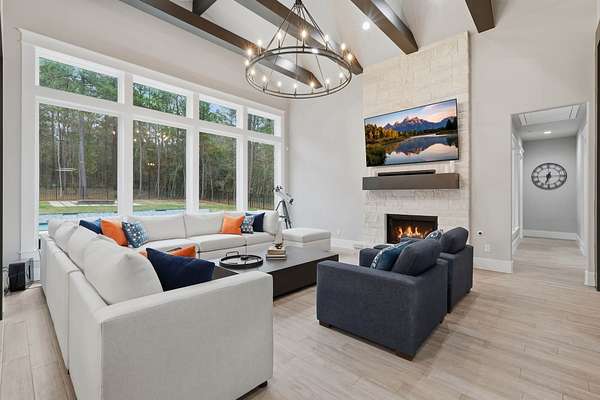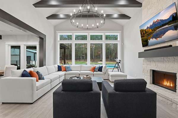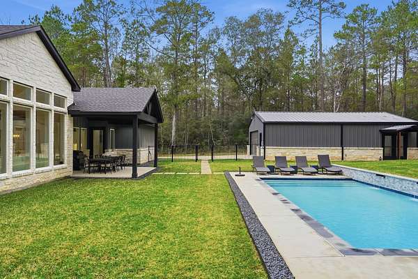 Cotemporary one story home in the forest! Stunning 3 bedroom, study, formal dining home located on the highly desirable acreage community of Texas Grand Ranch. Features wood look tile floors, modern lighting, cased windows, vaulted ceiling with beams, lots of large windows and open living for entertainment. Kitchen with built in refrigerator/freezer, convection microwave, stainless steel appliances, quartz countertops, Thor double oven range with 6 burners and griddle, under cabinet lighting and walk-in pantry. Split floor plan with 2 other bedrooms & full bath & double sinks. Study with tray ceiling & beams. Primary bedroom with door to private patio, tray ceiling & beams, spa like bathroom, barrel ceiling, gorgeous chandelier, large shower with beam details, double sink & freestanding tub. Laundry room w/ lots of cabinetry & dog shower! Serene back patio looks out to crystal blue pool, fire pit and large workshop barn that has electric & insulated. Generator & spray foam insulation!