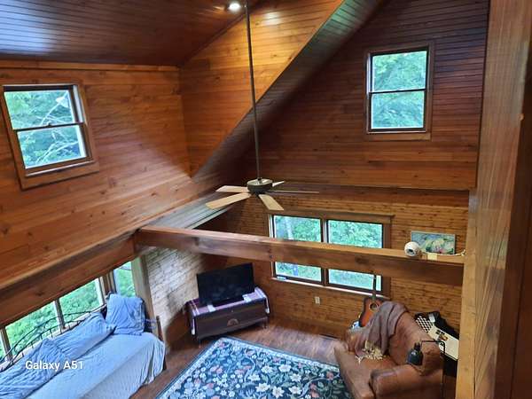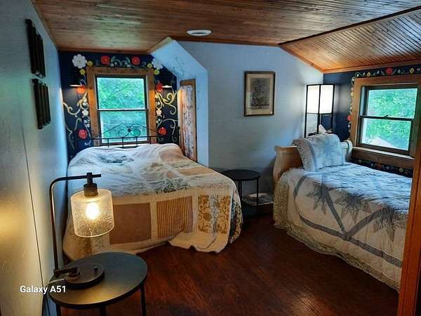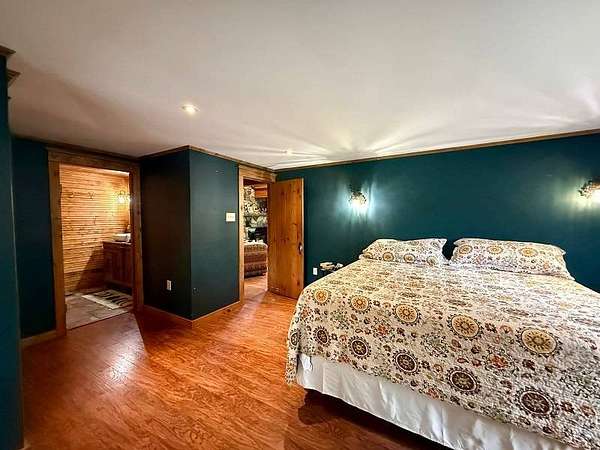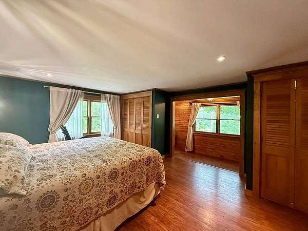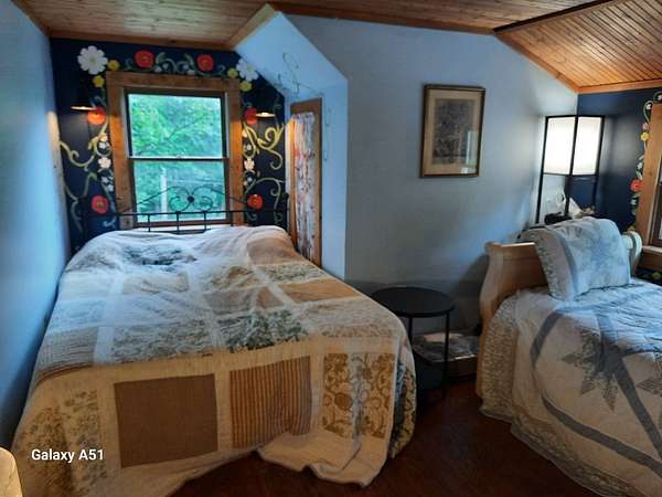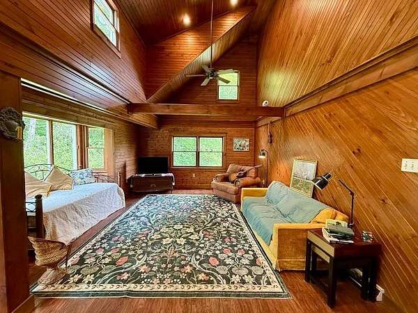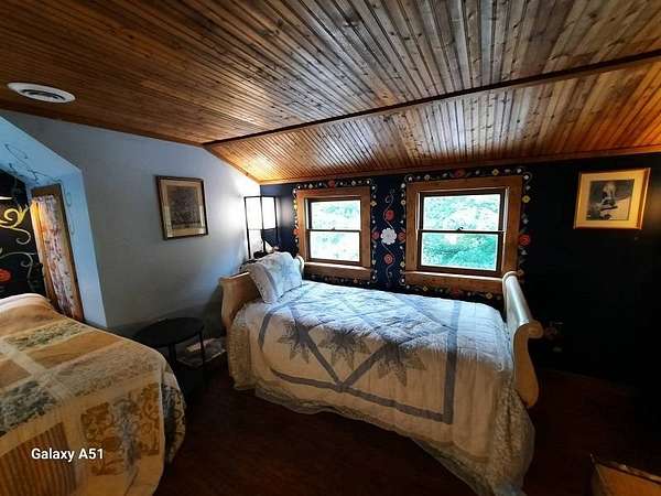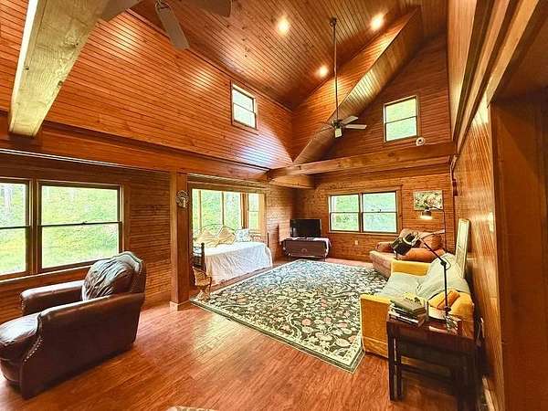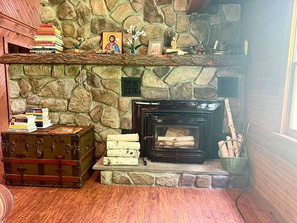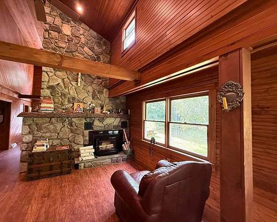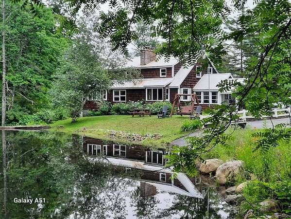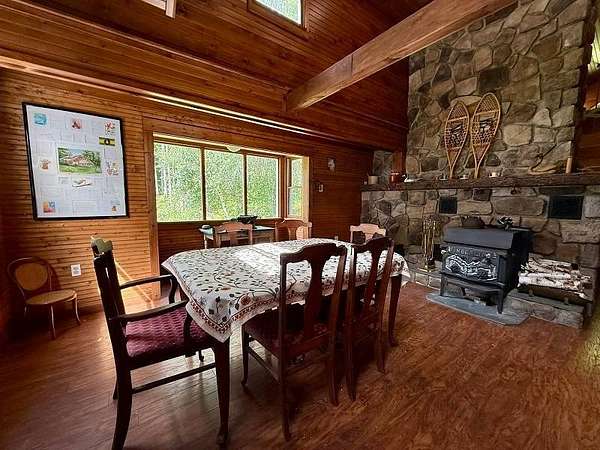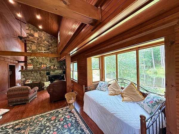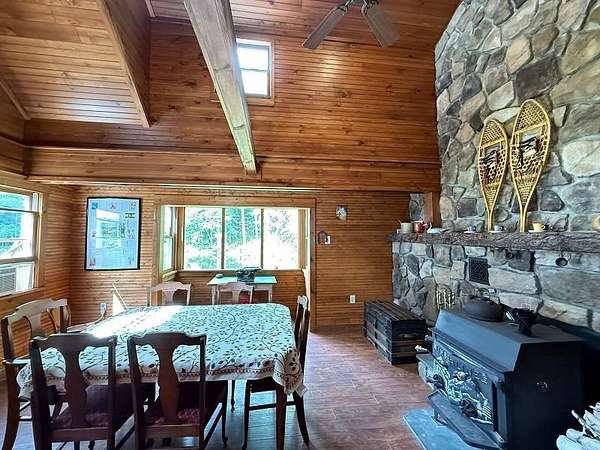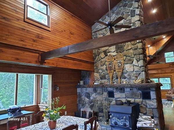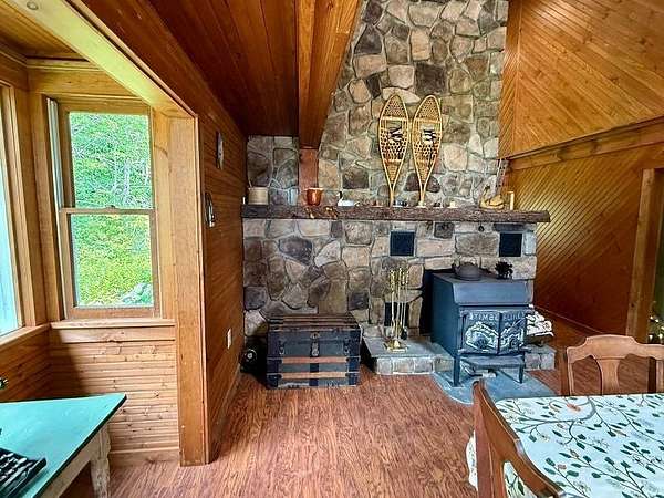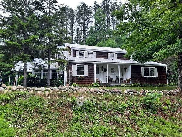 This home has the perfect mix of artistic elegance and architect design of an updated Adirondack home. When entering the home the unique character is immediately evident. The stone ceiling to floor double sided fireplace with hearth is breathtaking along with the high cathedral wood ceilings, beams, and flooring. There is a entrance porch with a mission style door. The dining room is perfect for any large gathering with friends and family.Galley kitchen off of the dining with a separate laundry area.Spacious living-room with the large stone fireplace, cathedral ceilings,and a window seat over looking the pond. The front entrance hall has a coat room, and 1/2 bath. There is a large primary bedroom down with an office area,includes a private bathroom with a custom double sink vanity and shower. The upstairs has a balcony overlooking the living room, two more bedrooms and a full bath. All the bathrooms have been updated and are very beautiful. The basement has a full brick wall fireplace waiting to be enjoyed and the room to be finished, if you choose. There is a garage door entrance and a spring fed / well in the basement along with a generator. The home includes a separate 4 bay garage with a heated work shop and plenty of room for all your toys.If that wasn't enough the property includes a pond with a small dam,trails throughout the 38.5 acre parcel that abuts to the State of NY. Also includes river frontage down stairs leading to the riverfront on the West branch of the Sacandaga River. This is a great property to enjoy the beautiful Adirondack wilderness. This is such a special unique property that really needs a visit to take it all in. Give us a call.