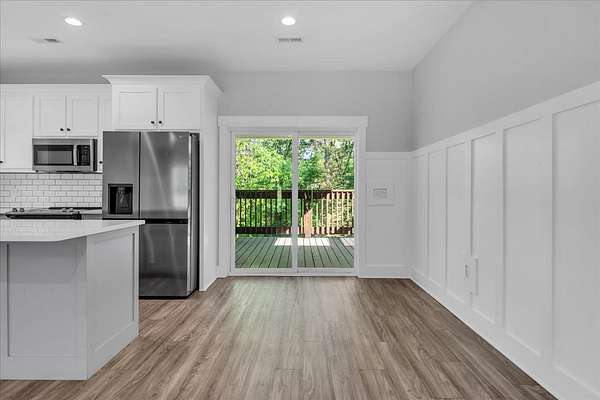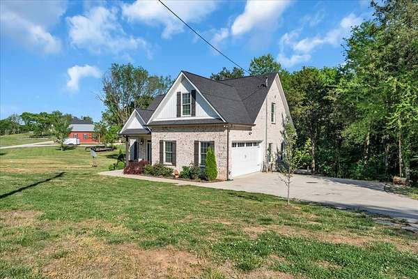 Located in Bell Buckle, this brick home offers a clean modern farmhouse feel with an inviting front porch, detailed trim work, and established landscaping. Inside, the open main level features wide‑plank flooring, board‑and‑batten wainscoting, and a spacious living area that flows into the kitchen and dining spaces. The kitchen includes shaker‑style cabinetry, a large island, subway tile backsplash, stainless appliances, and a window over the sink that frames a pleasant view. Sliding glass doors off the dining area open to a rear deck overlooking a tree‑lined backdrop, creating an easy indoor/outdoor gathering area. The main‑level suite shows off a generous bedroom with ceiling fan and a bath with double vanity, soaking tub with tile surround, and separate shower area. Additional bedrooms continue the neutral color palette and offer good natural light. Thoughtful storage is available throughout the home with multiple closets and a walk‑in pantry. The setting provides a yard with room for everyday use while maintaining a comfortable sense of privacy along the wooded edge. A versatile layout and move‑in ready finishes make this home easy to enjoy.