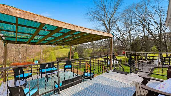Situated on approximately 4 acres, the property features a beautiful blend of open land and mature trees, providing a peaceful setting ideal for relaxing or entertaining.