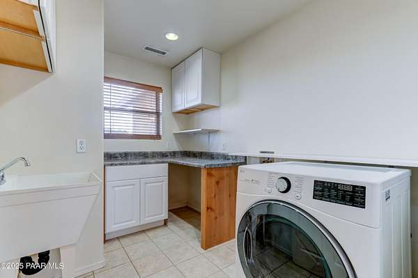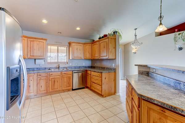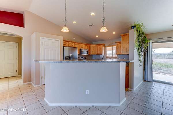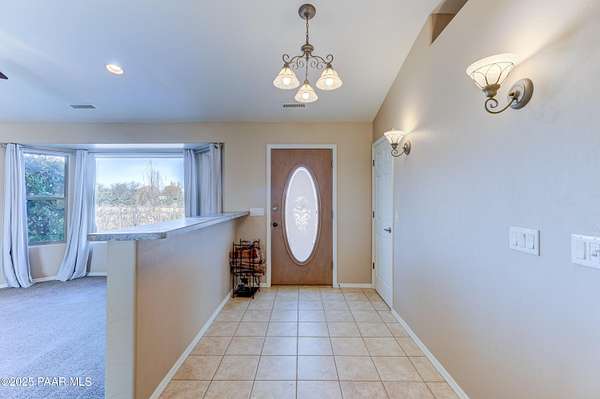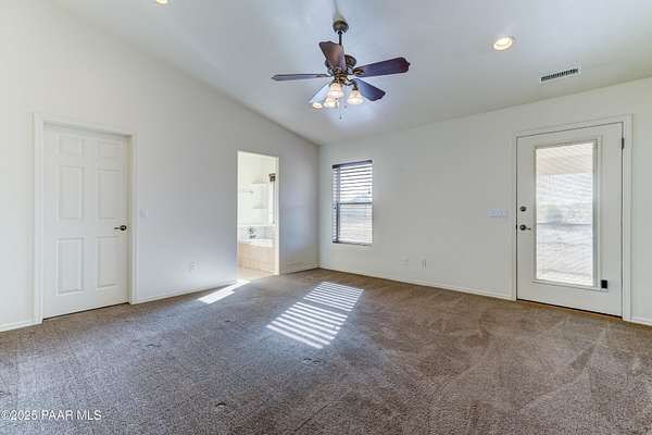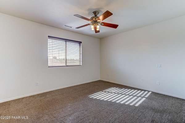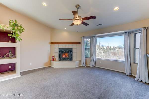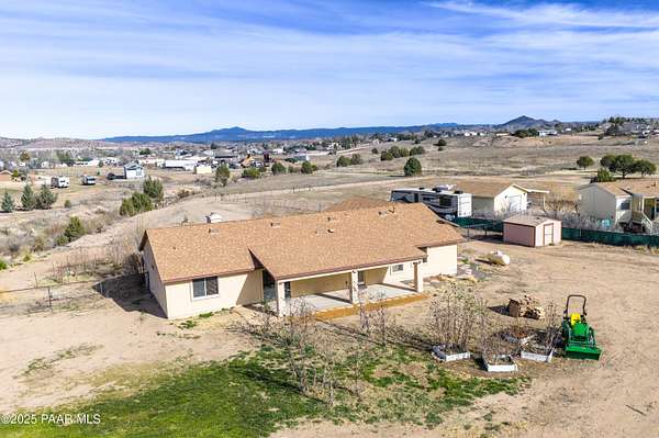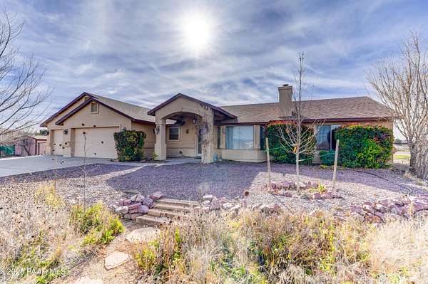 Welcome to 2820 Cobey Joe Trail, perfectly situated on two acres at the end of the road for exceptional privacy. Take in spectacular views of Granite Mountain and the San Francisco Peaks while enjoying the peace and tranquility of country living, while being only minutes to town. This home features vaulted ceilings that enhance the space with abundant natural light throughout. The split floor plan offers comfort and functionality, with a private primary suite that includes a walk in closet and its own exit to the patio, creating the perfect place to relax and enjoy unforgettable sunsets. A gas or wood burning fireplace adds warmth and character to the main living area. Recent updates include a roof installed in 2021 and a freshly painted interior, reflecting the pride of ownership found throughout the property. Outdoors, a butterfly garden awaits any green thumb, along with backyard fencing and thoughtfully planted landscaping. Bring your animals and toys, there is an RV gate to the backyard! The well produced 60+ GPM when drilled. Additional highlights include an oversized three car garage, a spacious utility room with a laundry folding counter and extra storage, and thoughtful details designed for everyday living. This is a rare opportunity to own a peaceful retreat with stunning views, privacy, and room to breathe.