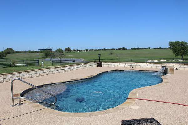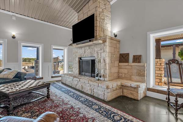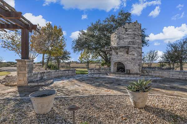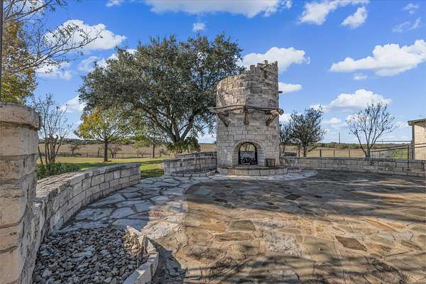 The outdoor stone fireplace and patio under lighted trees create an inviting space for relaxing or entertaining. With stunning sunrises and sunsets, this hilltop retreat provides a peaceful escape while still being just minutes from China Spring and Waco.
