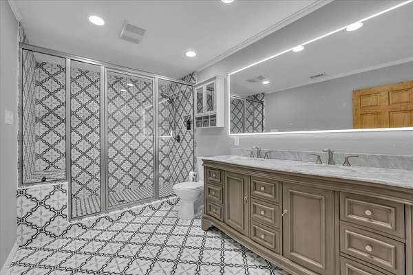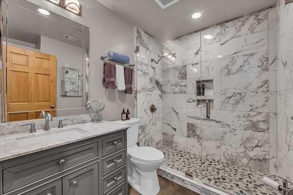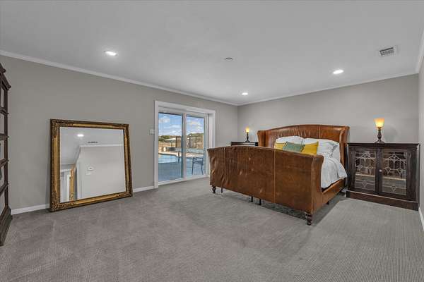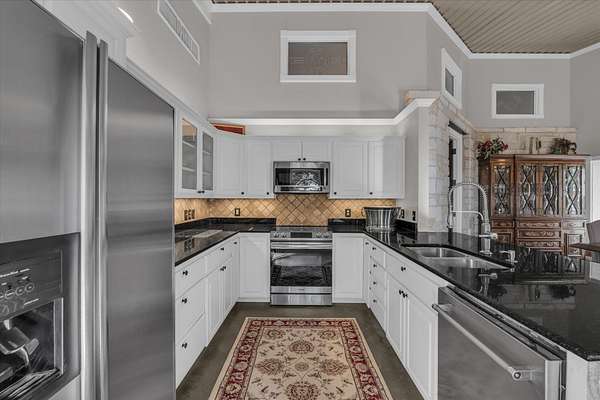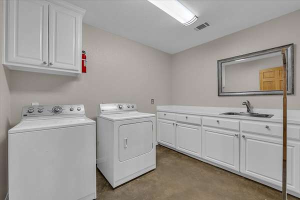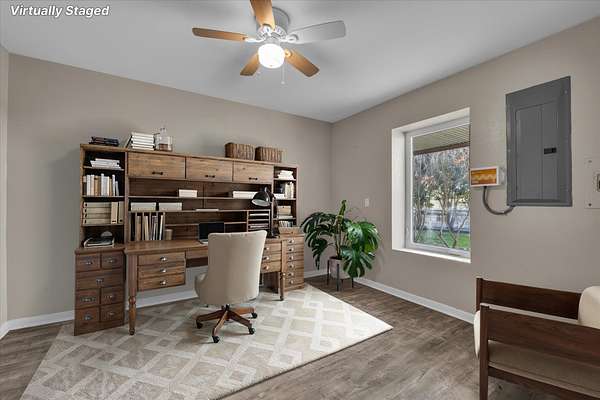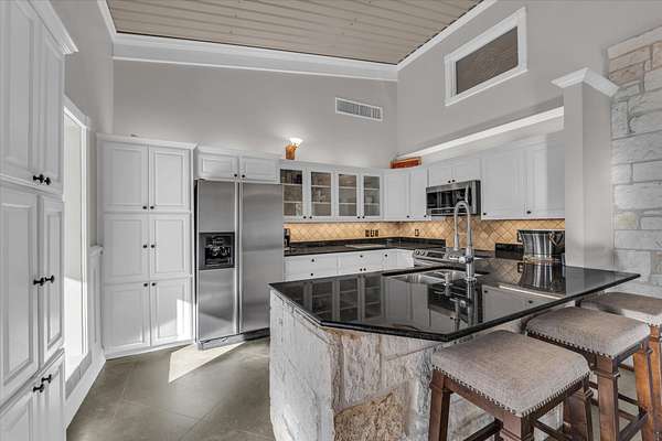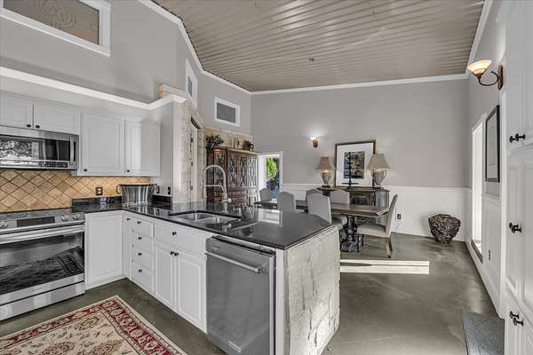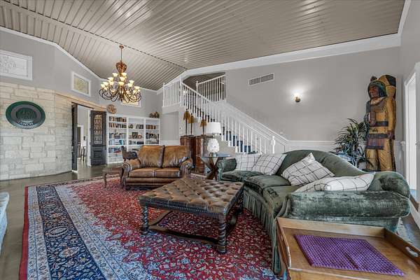 The main house features a floor-to-ceiling Austin stone fireplace, custom-built shelving, and handcrafted Spanish doors that add warmth and character. A versatile loft space can serve as a third bedroom, game room, or office. The detached guest house offers a private living area, bedroom, and bathroom, making it perfect for visitors or additional rental income. A four-car carport with storage and a workshop adds even more functionality.
