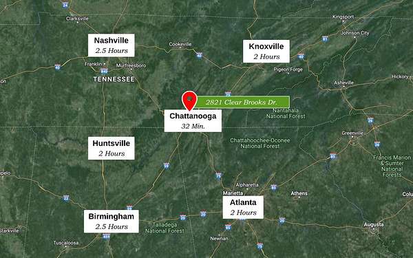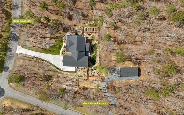 Nestled atop Signal Mountain, this home built in 2021 delivers. Desirable ONE LEVEL living (plus an upstairs bonus room) within 30 minutes of Downtown Chattanooga. The Grandview community offers quintessential East TN living with estate-size lots, wooded surroundings, and a true sense of arrival. 2821 Clear Brooks Dr. offers 5+ acres and a home comprised of 3 bedrooms, 2.5 bathrooms, bonus room, not to mention a GUEST HOUSE. An intuitive floor plan and thoughtful upgrades make everyday living effortless. Here, the outdoor spaces are an extension of your home. Enjoy a rocking chair front porch and a private screened back porch. Raised garden beds and separate fenced pet areas are ready for your next season, with grounds kept lush by a 4-zone irrigation system and low-level landscape lighting. 2-car attached garage features epoxy floors and built-in workstation. The detached garage AND finished apartment offers ideal flex space for guests or a home office. The finished apartment is on the ground level with a private entrance - no stairs! Whole-home upgrades complete the picture: whole-house speaker system, water filtration, Generac generator, Reme Halo HVAC-integrated air purifier, RV HOOKUP, and encapsulated crawl space. Nashville, Knoxville, Atlanta, and Huntsville are all within roughly 2 hours, making this a rare find with everyday convenience and regional reach. Schedule your private showing today.