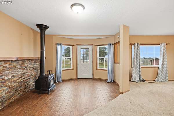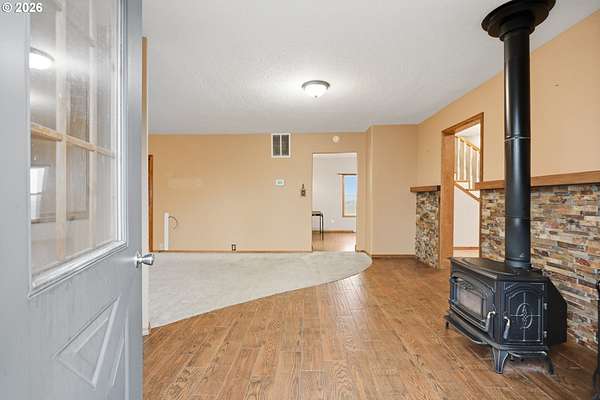 - Forced Air, Heat Pump, Wood, Wood Stove
