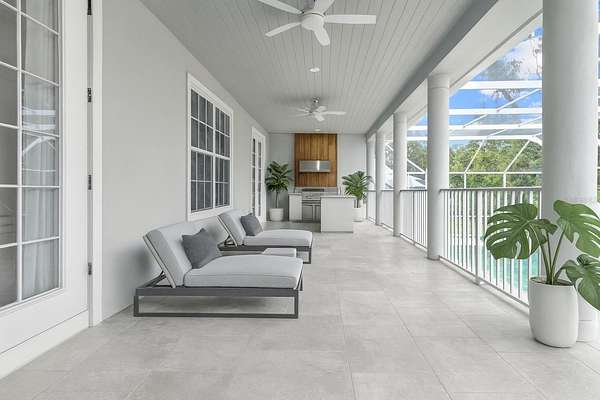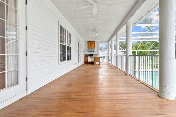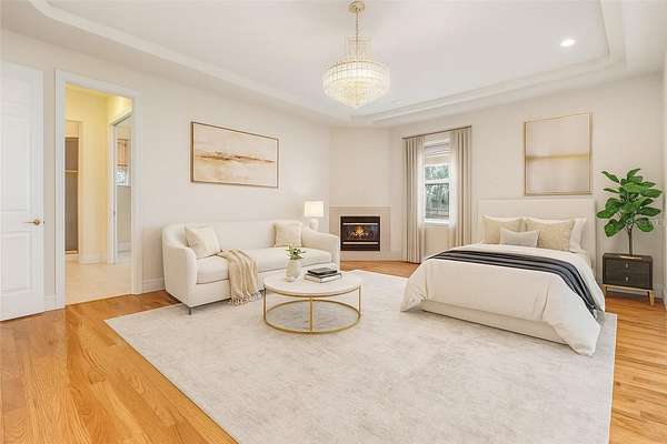 The first-floor primary suite features coffered ceilings, two large walk-in closets, a private fireplace, dual vanities, and direct access to the screened-in pool and outdoor kitchen area. The main level also includes a large eat-in kitchen with an expansive butler's pantry, formal dining room, home office, interior laundry room, and a versatile flex room at the front of the home.