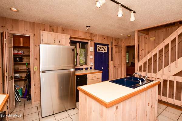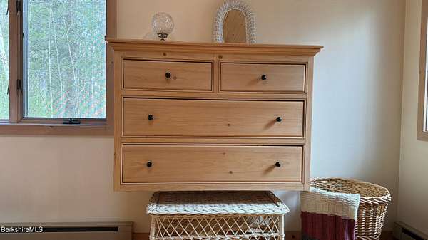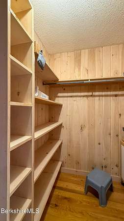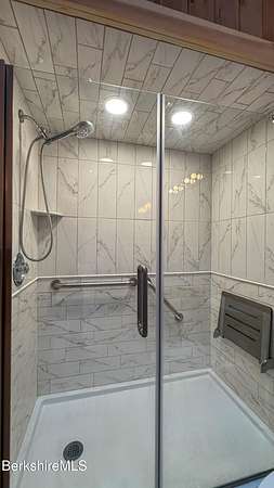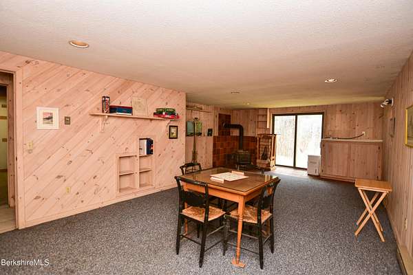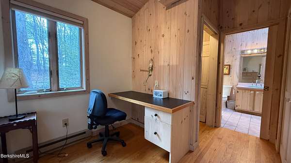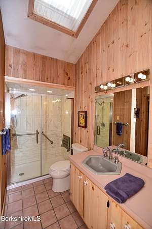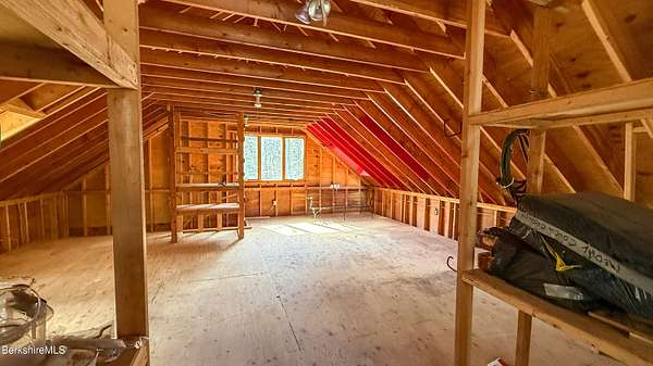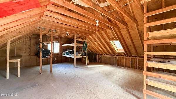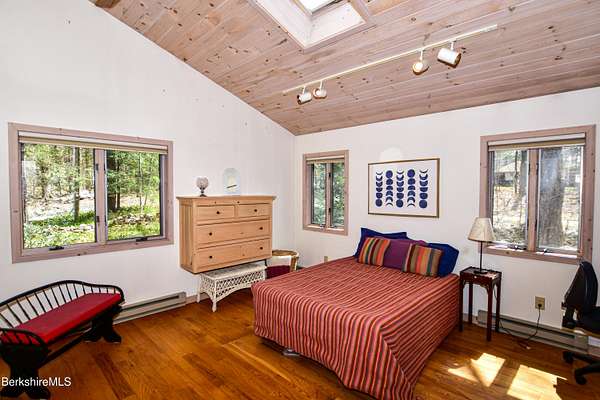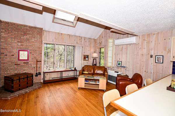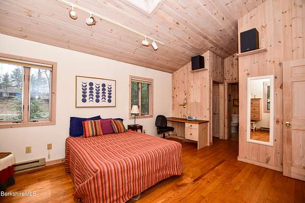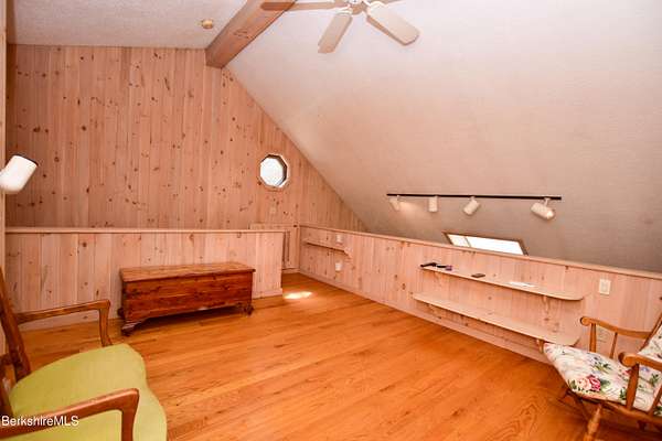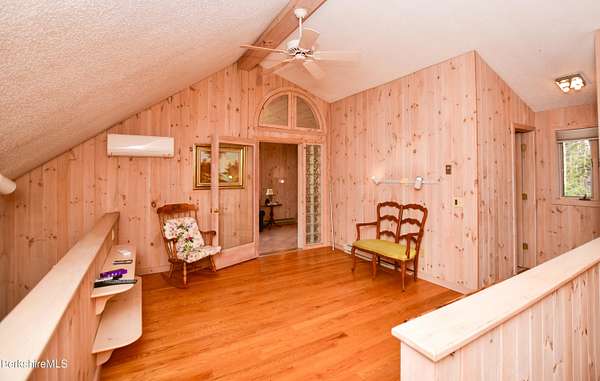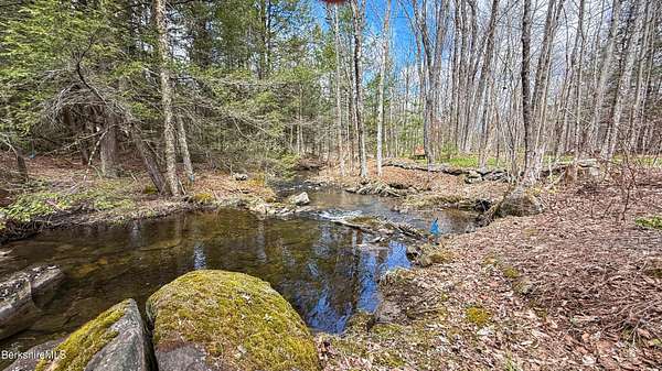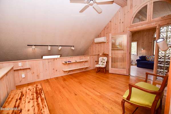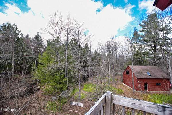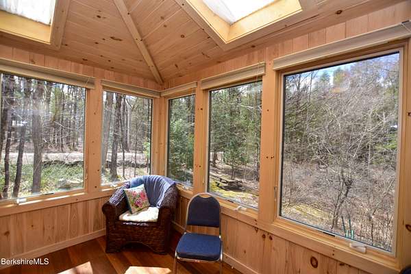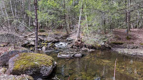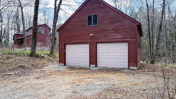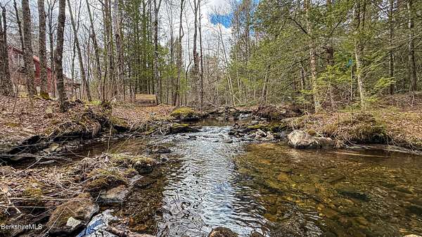 Nice 3 bedroom contemporary home set on over nine acres with Center Pond Brook flowing past the garden areas & through the back yard. The front porch opens onto the main kitchen & living areas with hardwood floors & cathedral ceilings. French doors lead to the sunroom overlooking the garden areas. The first floor primary bedroom features two walk in closets, built in dressers & desk. More built ins are found in the recently updated first floor bath. The upper level loft overlooks the living area & includes a full bath with tub/shower combination. A deck in the upstairs bedroom has views of the garden areas & brook. A large recreation room on the lower level features a slider to the gardens. The detached 2 car garage with large loft has many potential uses, studio, ADU, storage, etc.
