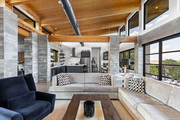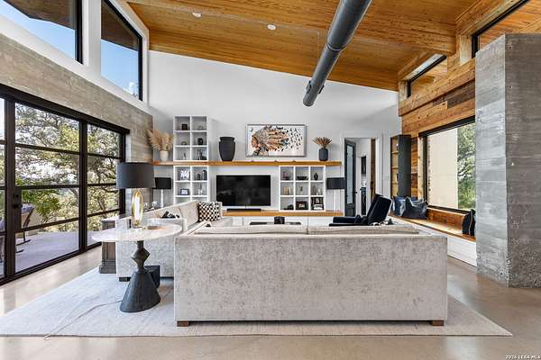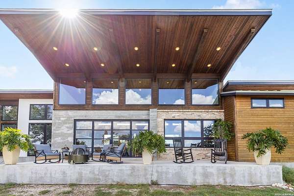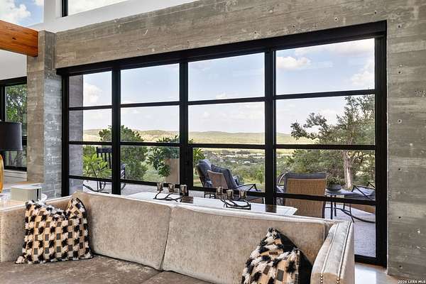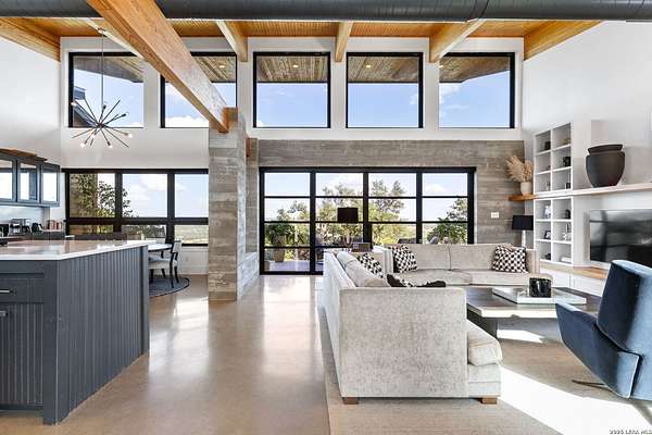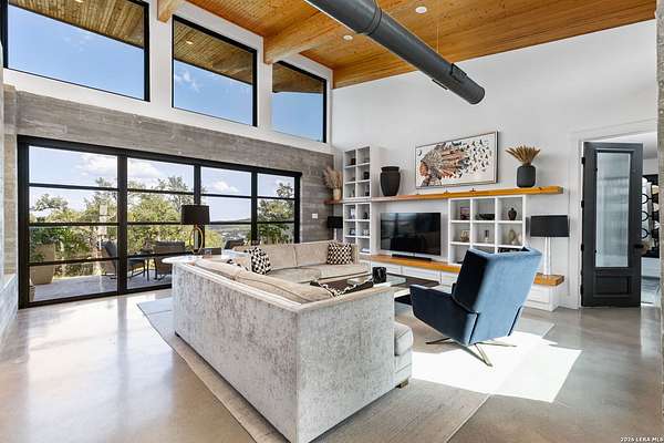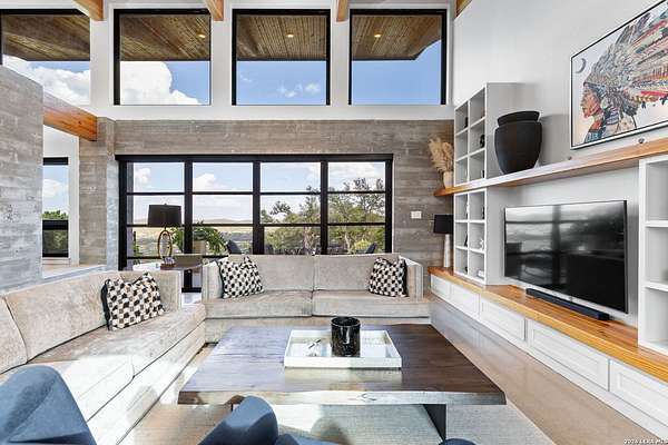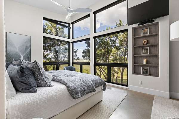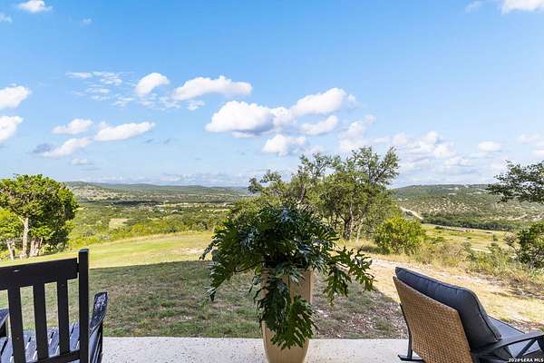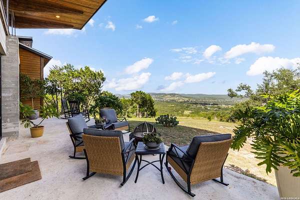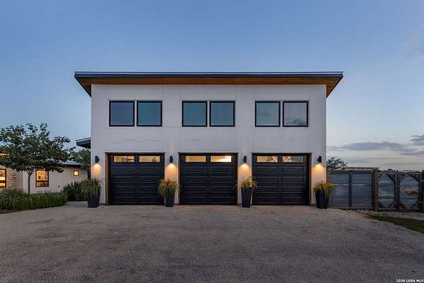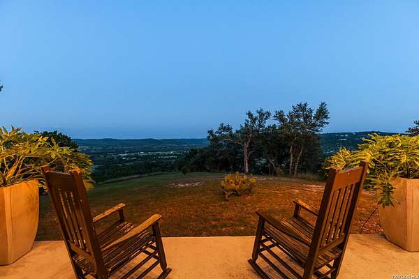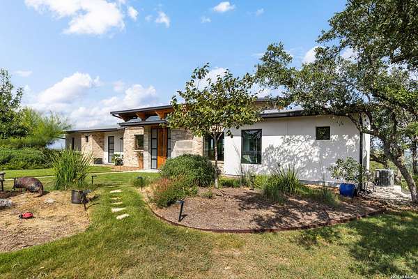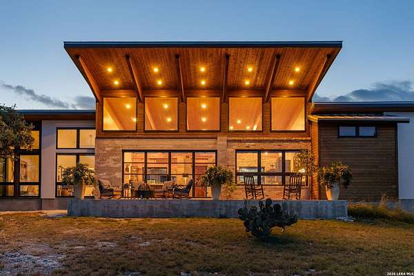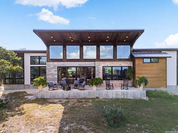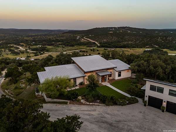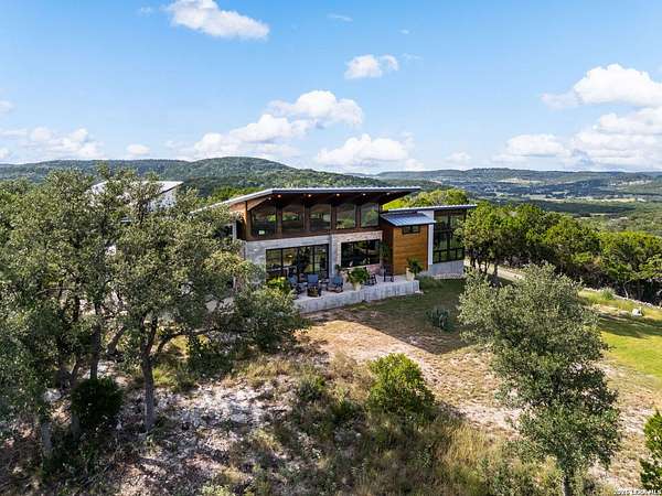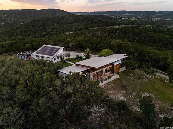 Discover this rare refuge atop your own private hill, with breathtaking 360-degree views of the Texas Hill Country. This modern sanctuary offers sweeping panoramic views and spans 16.08 acres within the exclusive, gated Hills of Bandera Ranch community, bordering over 5,000 acres of Texas hill Country Natural Area State Park with a private park entrance. This 3-bedroom, 2.5-bathroom residence spans 2,331 sq. ft. and is beautifully custom crafted with steel, glass, concrete, and wood. Lush native plantings and in ground irrigation create a living backdrop of Monarch butterflies, hummingbirds, and restorative birdsong. Expansive walls of windows showcase spectacular Hill Country views, creating light-filled spaces and a seamless indoor-outdoor connection. From the effortless ease of motorized blinds to the whimsical charm of historic doors, every detail-including a bespoke primary suite closet and extensive custom cabinetry-has been curated to magnify the home's distinguished character. Engineered for self-sufficiency and peace of mind, this home features an interconnected 11.88 kW solar energy system, featuring panels, four Tesla Power-walls, a whole-house generator, rainwater harvesting, a deep private well, and advanced RO filtration. Topped with durable standing-seam metal roofing and custom gutters, this resilient retreat offers a rare blend of high-efficiency luxury and off-grid autonomy. The property includes a detached three-car garage with a fun bunk room above and a private office with its own entrance and panoramic working views. Automatic iron and wood entrance gates anchored by concrete pillars and fencing, shelter the upper acreage, offering a refined and private Hill Country arrival. Whether you're seeking peaceful mornings, golden Hill Country sunsets, or wide open, vivid starlit nights, this property exudes a rare blend of modern architecture, sustainable amenities, and the awe-struck beauty of the majestic rolling Hills of Texas.