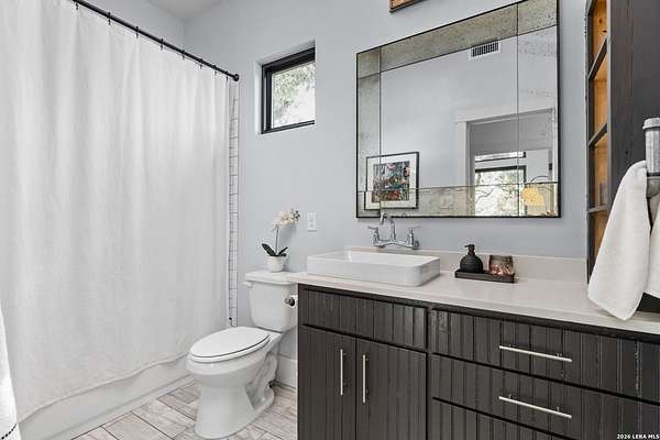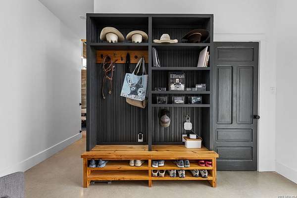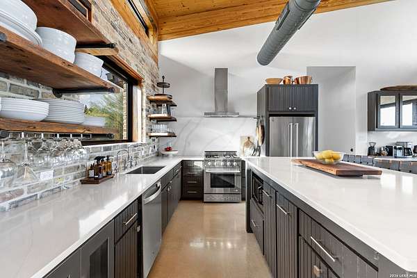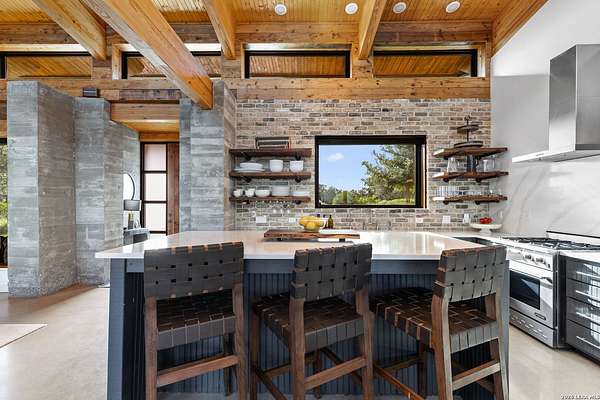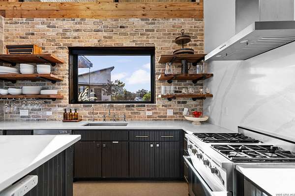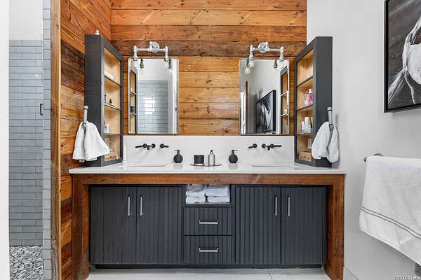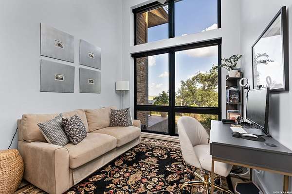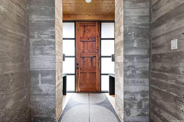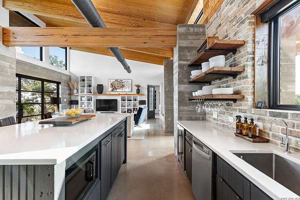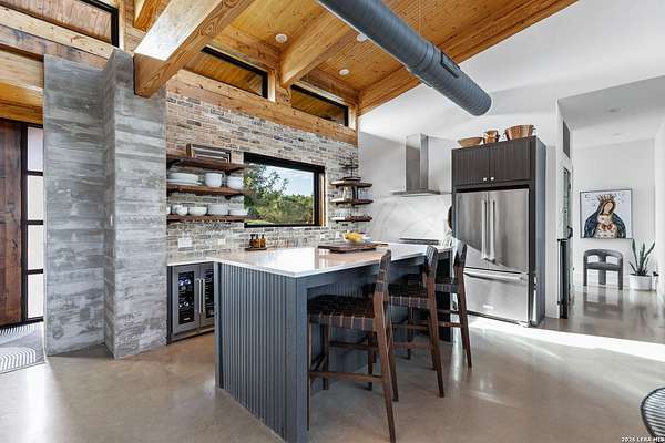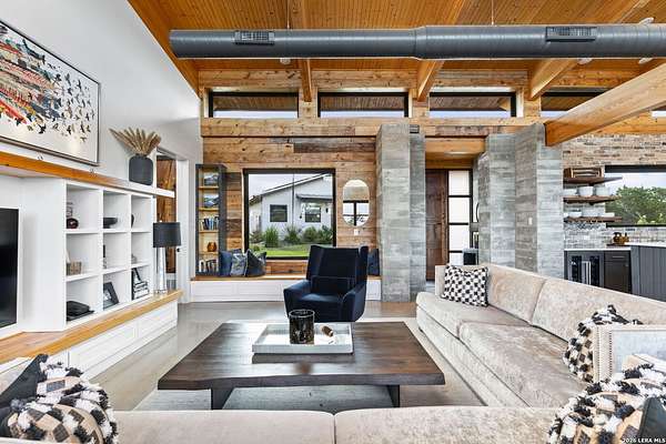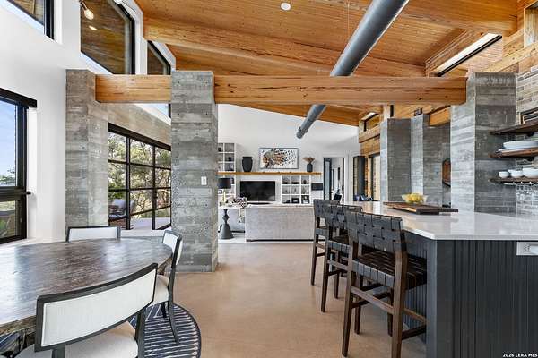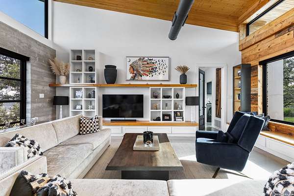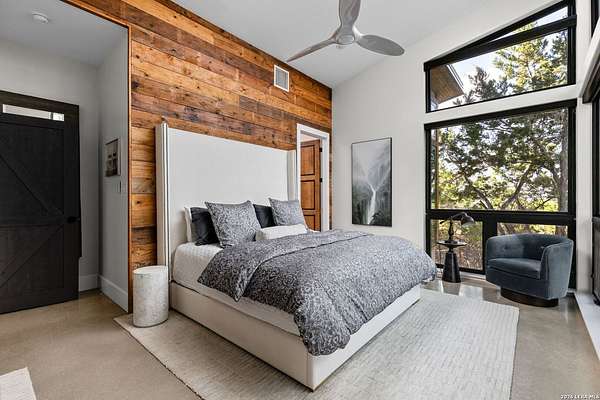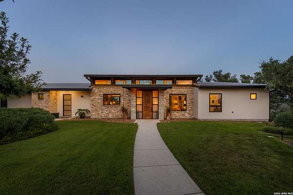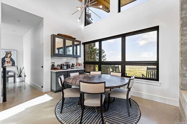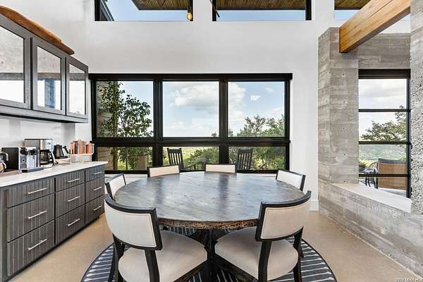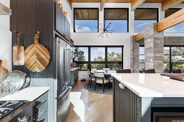Discover this rare refuge atop your own private hill, with breathtaking 360-degree views of the Texas Hill Country. This modern sanctuary offers sweeping panoramic views and spans 16.08 acres within the exclusive, gated Hills of Bandera Ranch community, bordering over 5,000 acres of Texas hill Country Natural Area State Park with a private park entrance. This 3-bedroom, 2.5-bathroom residence spans 2,331 sq. ft. and is beautifully custom crafted with steel, glass, concrete, and wood. Lush native plantings and in ground irrigation create a living backdrop of Monarch butterflies, hummingbirds, and restorative birdsong. Expansive walls of windows showcase spectacular Hill Country views, creating light-filled spaces and a seamless indoor-outdoor connection. From the effortless ease of motorized blinds to the whimsical charm of historic doors, every detail-including a bespoke primary suite closet and extensive custom cabinetry-has been curated to magnify the home's distinguished character. Engineered for self-sufficiency and peace of mind, this home features an interconnected 11.88 kW solar energy system, featuring panels, four Tesla Power-walls, a whole-house generator, rainwater harvesting, a deep private well, and advanced RO filtration. Topped with durable standing-seam metal roofing and custom gutters, this resilient retreat offers a rare blend of high-efficiency luxury and off-grid autonomy. The property includes a detached three-car garage with a fun bunk room above and a private office with its own entrance and panoramic working views. Automatic iron and wood entrance gates anchored by concrete pillars and fencing, shelter the upper acreage, offering a refined and private Hill Country arrival. Whether you're seeking peaceful mornings, golden Hill Country sunsets, or wide open, vivid starlit nights, this property exudes a rare blend of modern architecture, sustainable amenities, and the awe-struck beauty of the majestic rolling Hills of Texas.