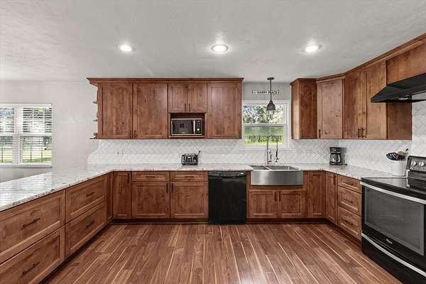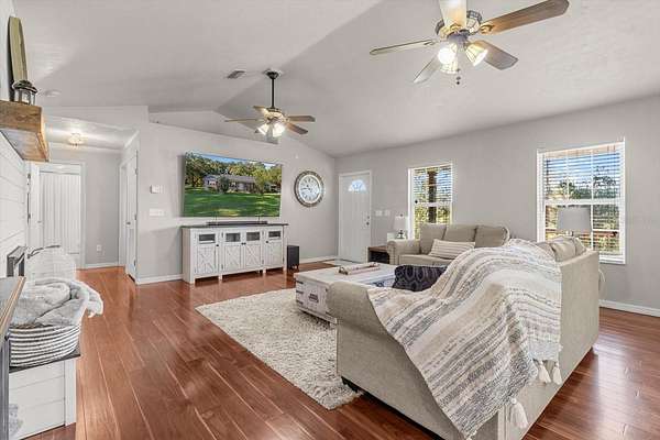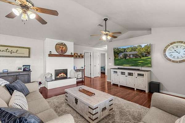 Welcome to your dream farmhouse retreat! Situated on 5 fully fenced acres with mature trees and plenty of open space, this beautifully updated 3-bedroom, 2-bath modern farmhouse offers nearly 2,200 square feet of stylish and functional living. Inside, you'll find an open floor plan with vaulted ceilings, crown molding throughout, and a stunning shiplap fireplace anchoring the great room. The family room features charming tongue-and-groove ceiling and wall accents, adding to the home's cozy character.