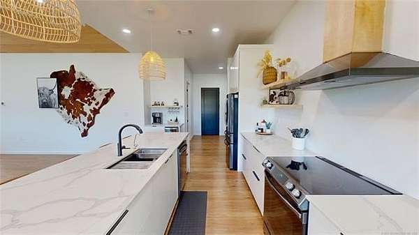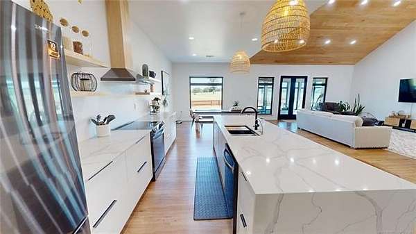 4 BEDROOM, 2 BATH NEWER BUILT UPSCALE HOME WITH ATTACHED 2 CAR GARAGE. GORGEOUS OPEN LIVING AREA WITH HIGH/ WOOD CEILING AND GOURMET KITCHEN INCLUDING A SPRAWLING ISLAND AND LARGE WALKIN PANTRY!! THE EXTERIOR FEATURES A LARGE 60X 120 RED LIVESTOCK BARN, 40 X 120 OPEN BARN, A 30 X50 SHOP ( WITH ELECTRIC, WATER, KITCHEN, BATHROOM)