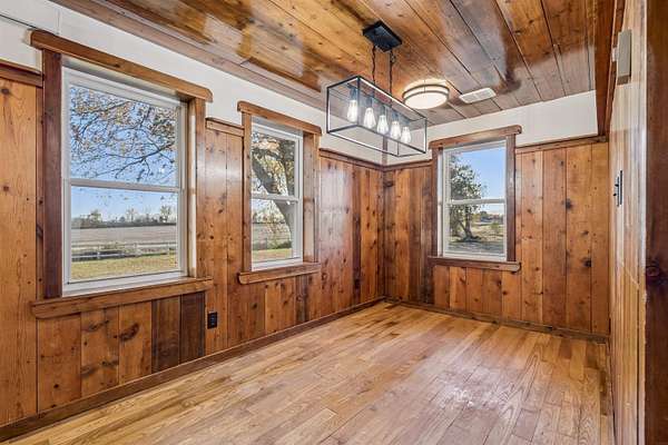 This handsome farmhouse combines rustic charm with modern comfort, featuring rich wood accents reminiscent of a classic cigar bar. The open floor plan and beautiful hardwood floors create a warm, inviting atmosphere throughout. Main-level laundry adds convenience, while two bedrooms, a den, and one and a half baths provide flexible living space. Thoughtful built-ins offer stylish and functional storage. Set on 2.64 picturesque acres, the property is a gardener's dream with mature apple and peach trees, rhubarb, raspberries, and even a grapevine. For the outdoor enthusiast, theres a private 110-yard rifle range with berm. Several outbuildings, including a corn crib, cattle shed, pole building with chicken coop, and a shop, offer ample storage and endless possibilities for hobbies or small-scale farming. A two-stall attached garage plus parking options in the pole sheds provide plenty of space for vehicles and equipment.