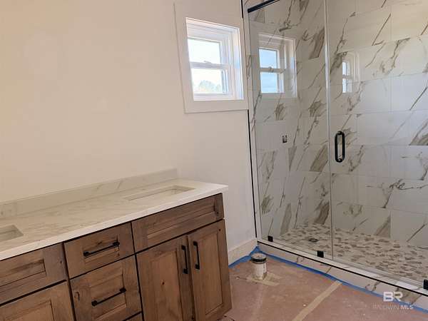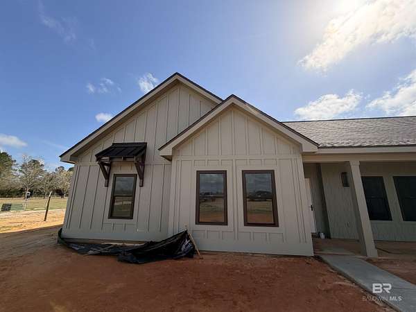 Brand new custom home, nearly finished, in Elberta!! Enjoy modern living with room to spread out, all on a private acreage setting. Situated on two fully fenced acres with a spacious 40'X40' Pole barn - perfect for storage, hobbies or equipment. This beautifully crafted home features Luxury Vinyl Plank flooring throughout, custom trim moldings and impact glass doors and windows. The interior showcases vaulted ceilings, a gas fireplace, solid wood custom cabinetry, detailed trim work and high end upgrades throughout, including instant hot water heater. With four bedrooms and three full bathrooms, the home offers both comfort and functionality. Each bathroom includes tiled shower/tub enclosures and solid wood cabinetry, continuing the home's quality craftsmanship and cohesive design. The spacious primary suite is private and includes a luxurious bathroom with a deep soaking tub, tiled walk-in shower, double vanity and a large walk-in closet. Gold Fortified. Professional Photography Scheduled upon completion... Should be finished by the end of March 2026 Buyer to verify all information during due diligence.