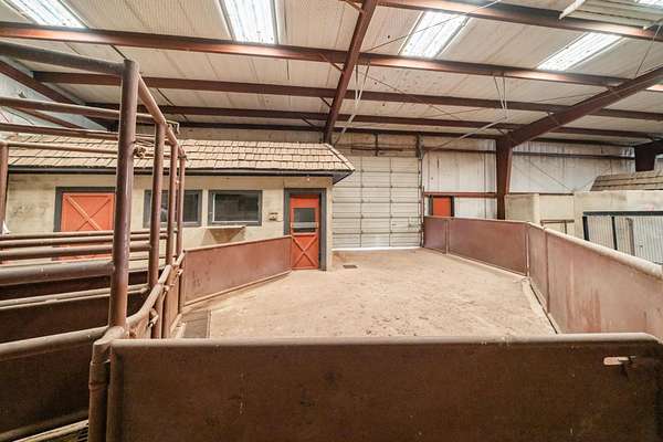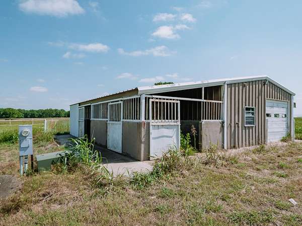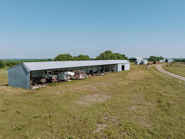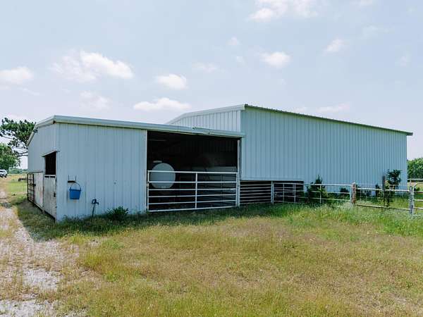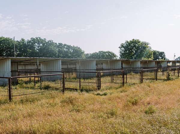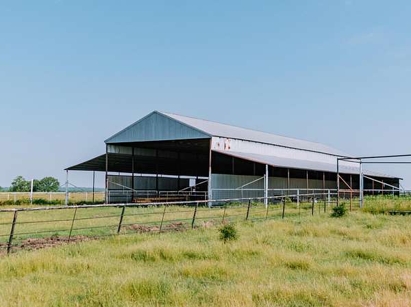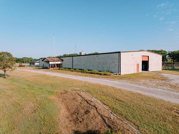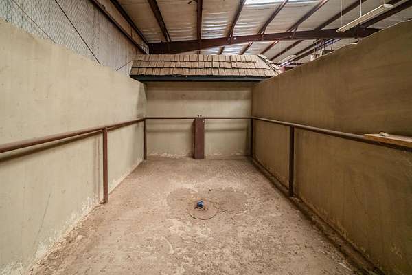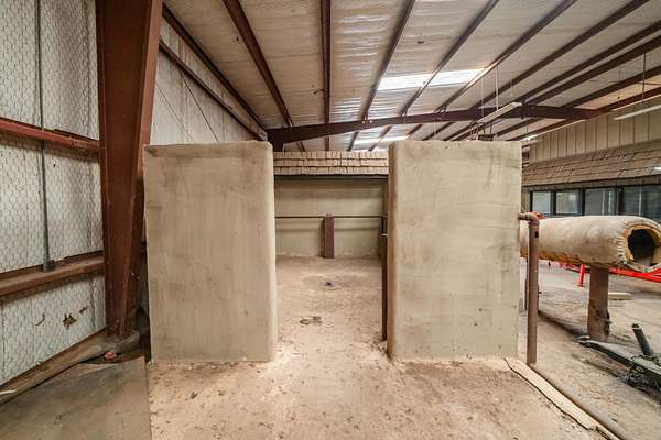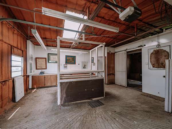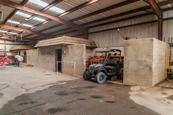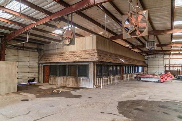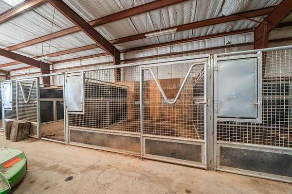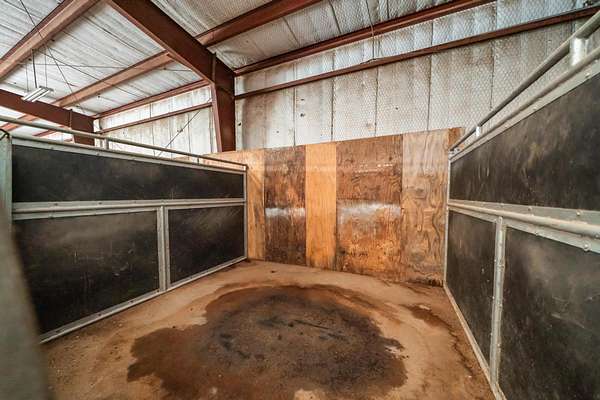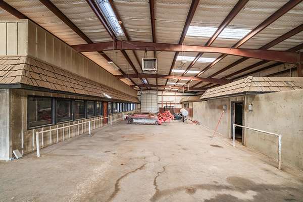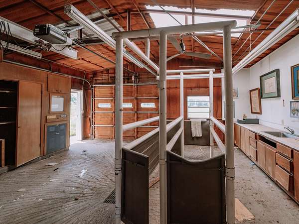 The STAR brand headquarters building offers 13,440 square feet of wide-span open space with 18-foot ceilings, designed to support high-volume equine operations. Located just beyond the front gate, the main building is thoughtfully positioned for optimal access and efficiency. It features six offices, a kitchen and bathroom, a large tack room, and three custom wash bays with built-in drains. Multiple roll-up doors provide easy access to adjacent loafing barns, and the all-concrete flooring supports heavy-duty use--currently utilized for equipment storage. Originally serving as the central hub of ranch operations, this versatile facility is surrounded by pens and arenas, and presents a wide range of potential uses beyond its initial design.