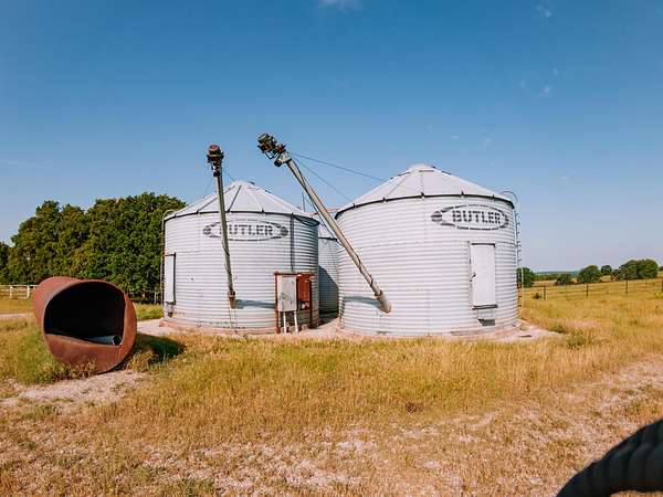 The livestock facility includes multiple sorting pens, alleyways, loading ramps, and a highly functional layout designed to handle several hundred head of livestock at once with ease and efficiency. Large grain bins are also located in this area, providing significant storage capacity for livestock feed. Additionally, a separate building offers excellent space for equipment storage, along with an enclosed maintenance shop. This section of the ranch is powered by public electricity, ensuring reliable operation for all daily needs.