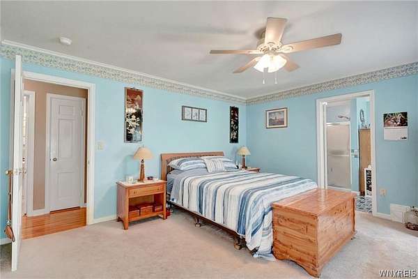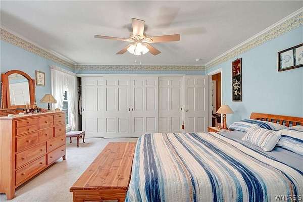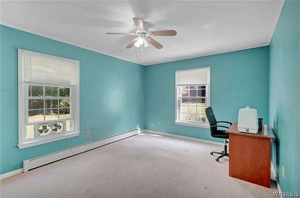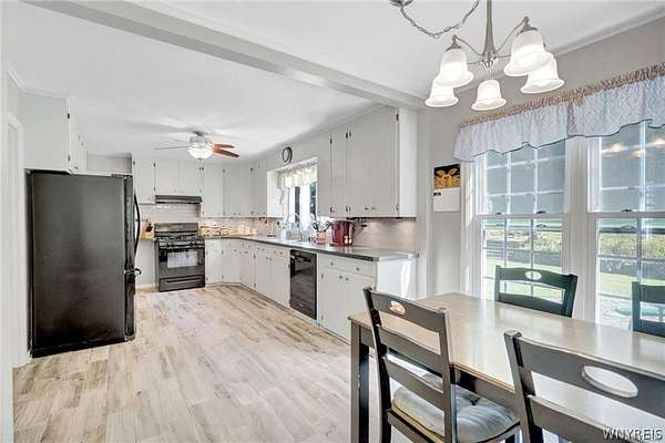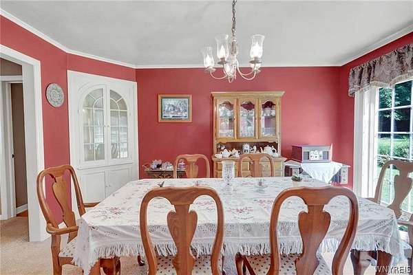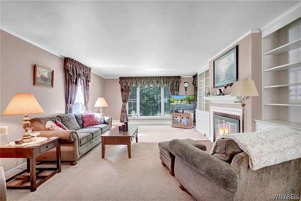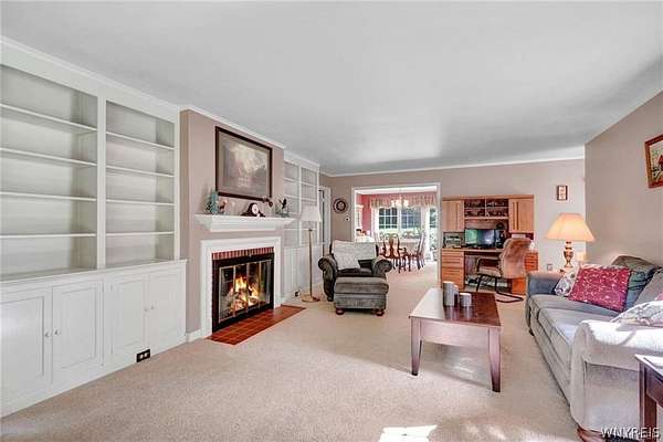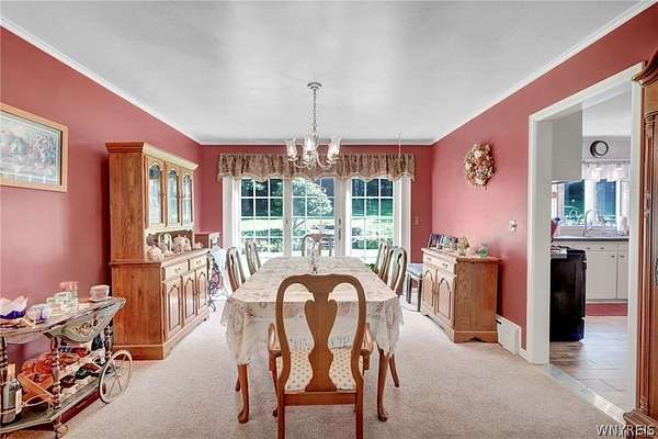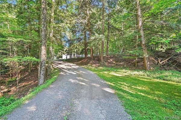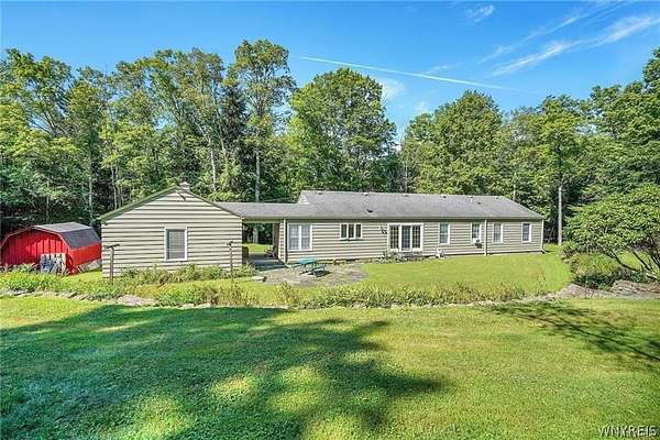 Over the river and through the wooded parcel; tucked away from it all is this lovely, well-maintained ranch style home situated on a mostly wooded nearly 6-acre parcel with its own private pond. The eat-in kitchen welcomes you through the breezeway from the attached two car garage; with beautiful views to the natural stone, terraced back yard perennial gardens, natural stone, patio and natural privacy in the wooded parcel. Newer countertops, flooring, and appliances, and lighting create an updated clean comfortable space for cooking, mealtime and entertaining. The formal dining room with sliders to rear yard provides a beautiful backdrop for those special dining occasions and celebrations. Dining room is open to the spacious living room with built-ins on either side of the fireplace and a large window that brings the very private outside in. You will enjoy having that private office space or a media room for you and your family. Large primary bedroom with built in shelving, drawers, and an entire wall of closet space, private bath with walk-in shower, vanity, beautiful tile floor and plenty of room for additional storage. Three spacious bedrooms with large closets for storage, and additional common full bath. Tucked away and secluded by nature yet minutes to shopping, dining, schools in the village of Wellsville.