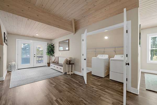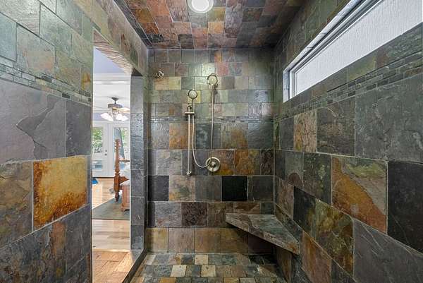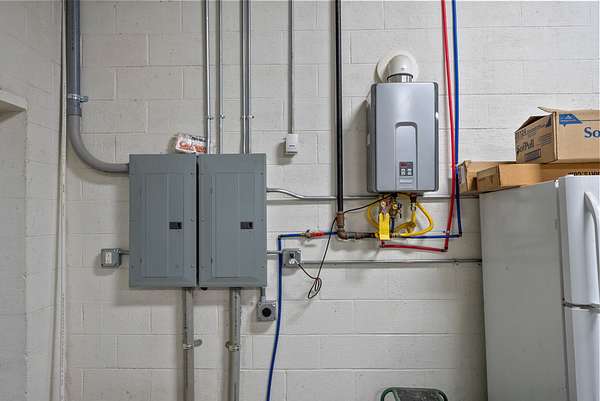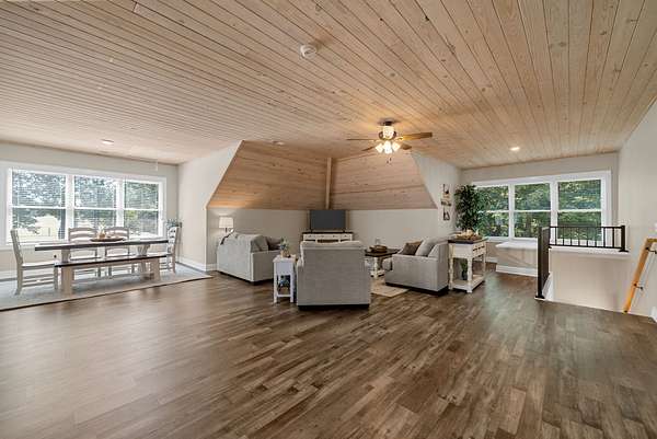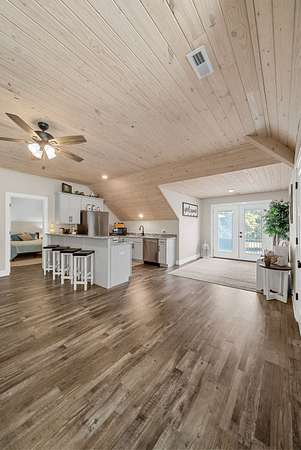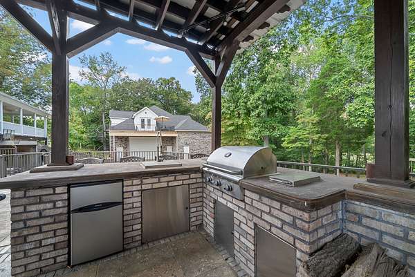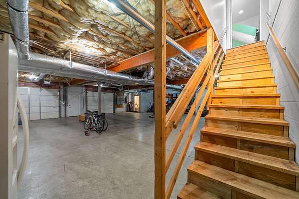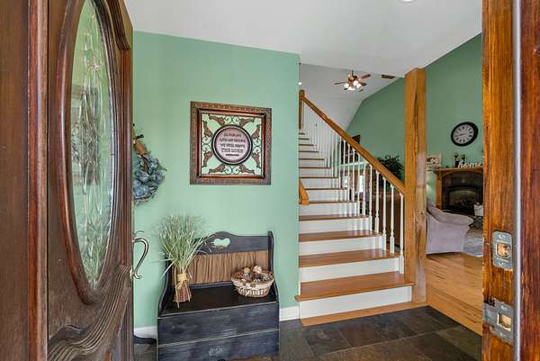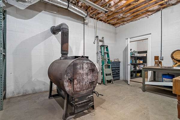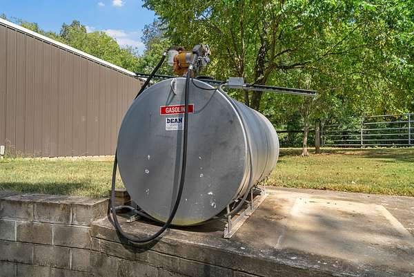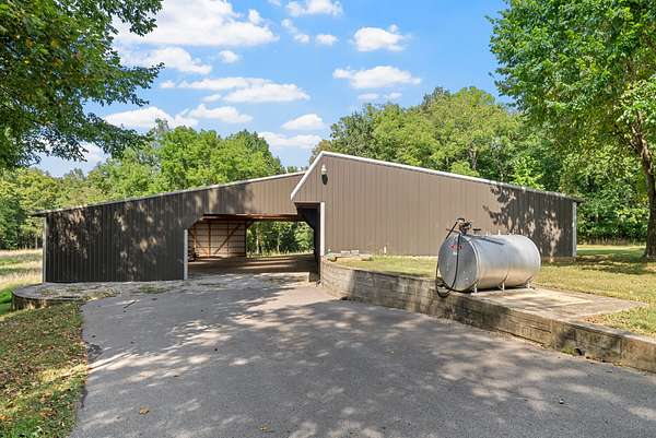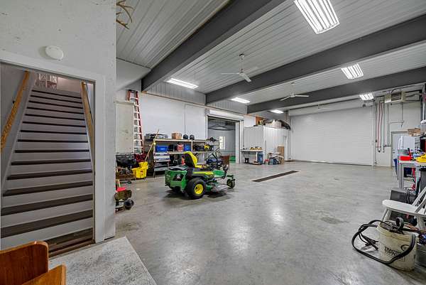 The home's exterior is just as impressive, featuring a quintessential 8-foot wraparound porch, perfect for enjoying your morning coffee or watching the sunset. Beyond the porch, the property is an equestrian's dream, with half of the land already fenced and ready for horses or cattle. A serene pond adds to the picturesque landscape. For peace of mind, the property is equipped with three underground 1,000-gallon propane tanks that service a Generac home generator and a large gas fireplace. Two Rinnai tankless water systems ensure a continuous supply of hot water, one for the main house and another for the apartment above the RV garage. A full bath and two storage rooms, one with a steel door for use as a safe room, are located in the basement, along with a two-car garage.