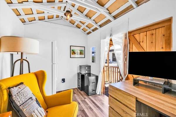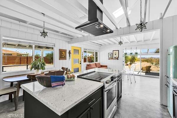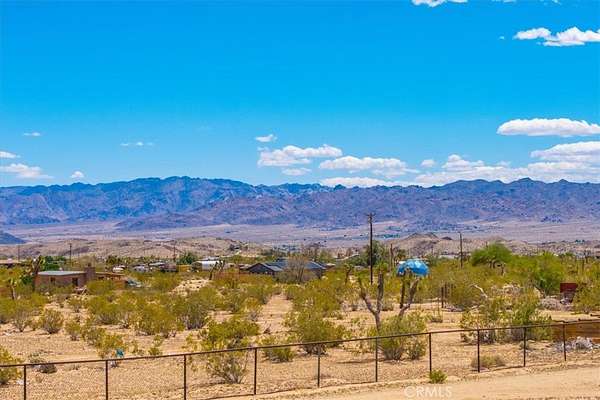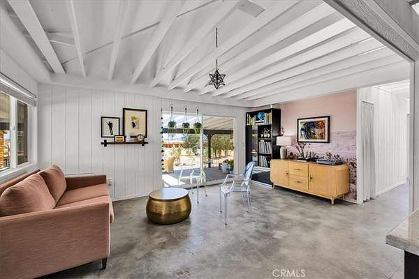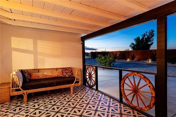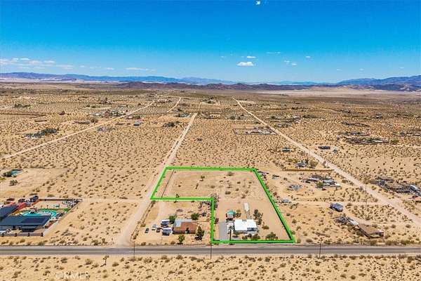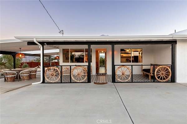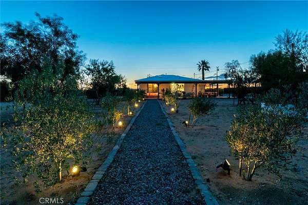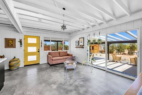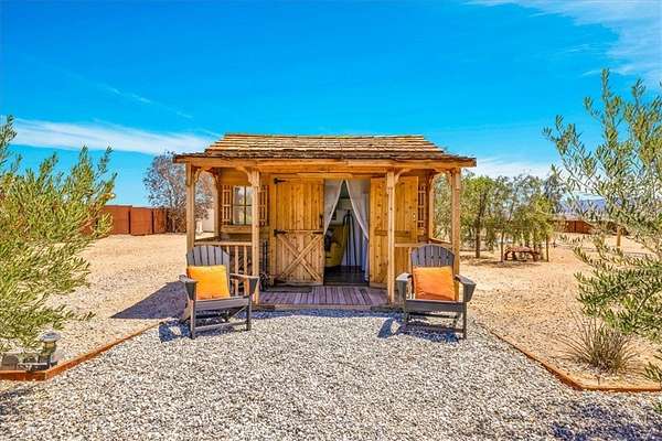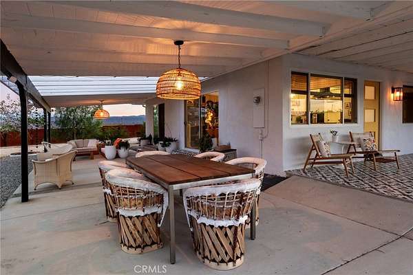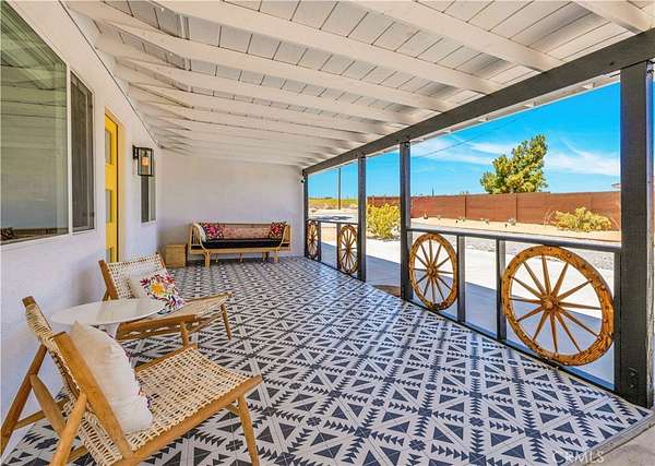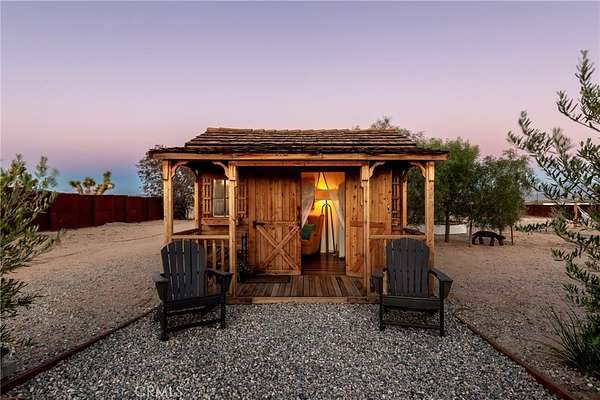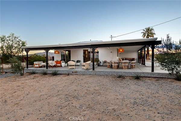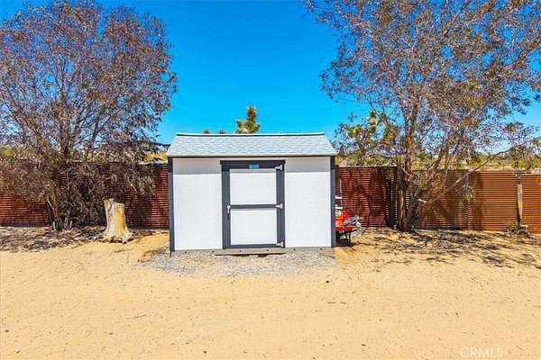 $20,000 PRICE IMPROVEMENT! This FULLY FURNISHED 3-bedroom, 2-bath rustic-modern compound rests on 3.51 acres in scenic Joshua Tree. Set on the mesa and fully fenced for privacy, the property offers sweeping views of the surrounding hills and mountains along with a tranquil desert atmosphere. Thoughtfully renovated, the home features polished concrete floors, white wood-paneled walls, skylights, and sliding glass doors in the bedrooms that fill the interiors with natural light. The open-concept kitchen, ideal for entertaining, includes a large island, sleek black cabinetry and fixtures, granite countertops, and a tile backsplash. The adjoining living area with large slider overlooking the backyard is enhanced by vaulted ceilings and exposed beams. Both bathrooms have been stylishly updated with tiled walk-in showers and contemporary lighting. Comfort and efficiency are ensured with Mitsubishi mini splits, upgraded electrical, a new water heater, and full gutters. Outside, a generous covered patio invites relaxation and gatherings, accented with rattan light fixtures and black-and-white Aztec tile at the entry and steps. A detached cedar shed with a covered porch, dedicated power, vinyl flooring, extra fridge, and lighting offers versatile use as an art studio, office, or yoga space. The property also includes an RV electrical hookup, ample parking, and a Tuff Shed for added storage. The L-shaped lot features paved road frontage and a side gate off Shifting Sands Trail--perfect for a potential second dwelling with private access. Outdoor highlights include two water meters, a pool with custom wood decking, a hammock circle, and mature, drought-tolerant landscaping with olive, acacia, pepper, and palo verde trees, as well as agave and cacti. Freshly graded trails at the rear provide a great way to explore the land by foot or even on horseback. Located just 15 minutes from Joshua Tree National Park, under 10 minutes to downtown, and less than 5 minutes from the Noah Purifoy Outdoor Art Museum, this one-of-a-kind desert retreat offers a rare blend of style, space, and location. Schedule your showing today!