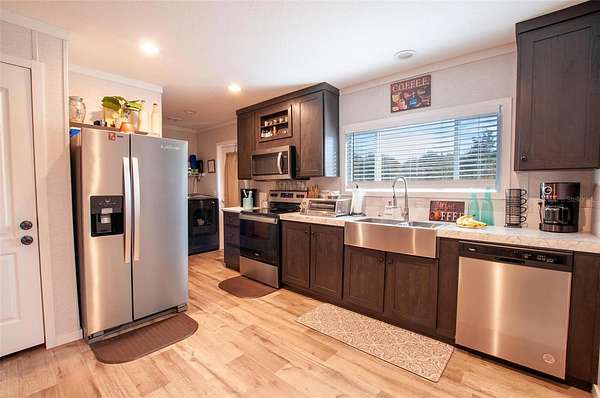 Set on 2.81 acres of open land in Arcadia, Florida, this beautifully maintained 2024 double-wide offers the space and freedom of country living with modern comforts throughout. The home features 2 bedrooms and 2 bathrooms along with an inviting covered front porch, perfect for enjoying peaceful mornings and quiet evenings beneath the shade of large, mature oak trees. Inside, you’ll find an open-concept layout where the dining area flows seamlessly into the living room, creating a comfortable and functional space for everyday living and entertaining. A sliding glass door fills the space with natural light and provides easy access to the outdoors. The modern kitchen is well-appointed with stainless steel appliances, ample cabinetry, generous counter space, and a large closet-style pantry offering excellent storage. A dedicated laundry area adds everyday convenience. The primary suite provides a private retreat with its own bathroom, while the second bedroom and bath offers flexibility for guests, family, or a home office. Outside, the property truly shines with spacious open acreage dotted with large, mature oak trees, a 3-car garage, two additional storage sheds, and plenty of room for equipment, recreational vehicles, animals, or future expansion. The 2.81-acre parcel offers endless possibilities for gardening, homesteading, or simply enjoying wide-open Florida skies. This home is peaceful rural living while remaining within reasonable distance to town amenities.